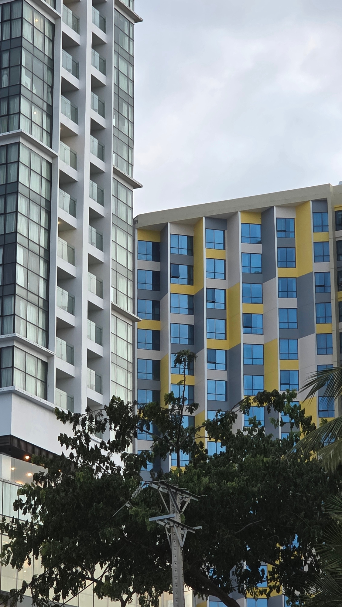 An upward-angled shot captures two modern buildings and surrounding foliage under an overcast sky in Nha Trang, Vietnam. The prominent building on the upper right is a multi-story structure with a st…read more