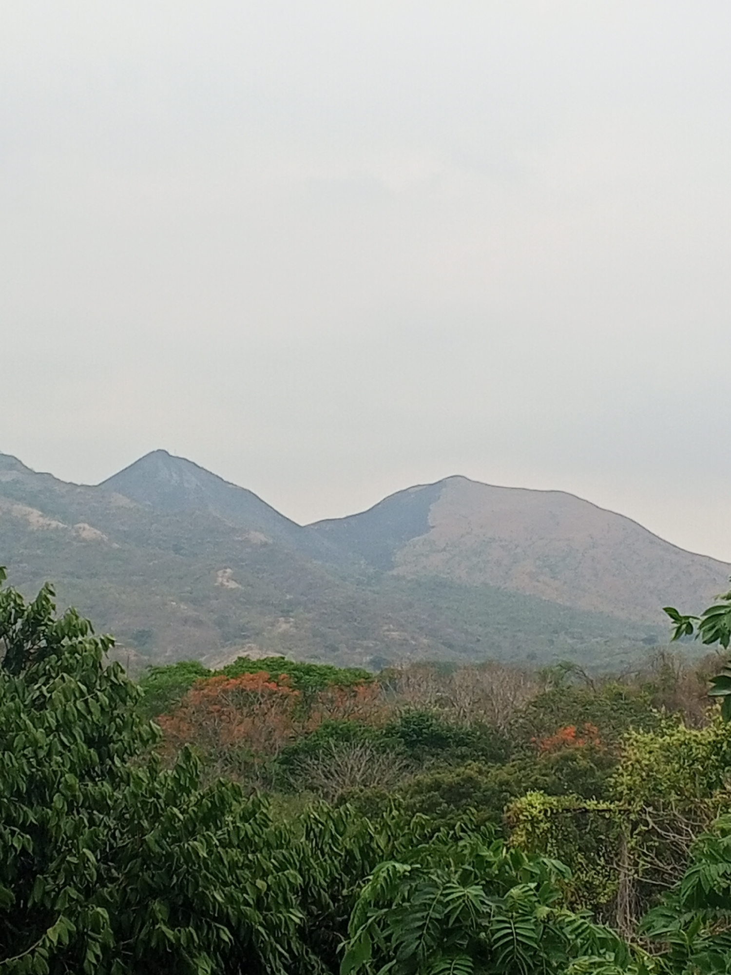 The image depicts a landscape scene in Tinaquillo, Venezuela, featuring two prominent mountains in the background. The mountain on the left appears steeper and darker in color, while the mountain on t…read more