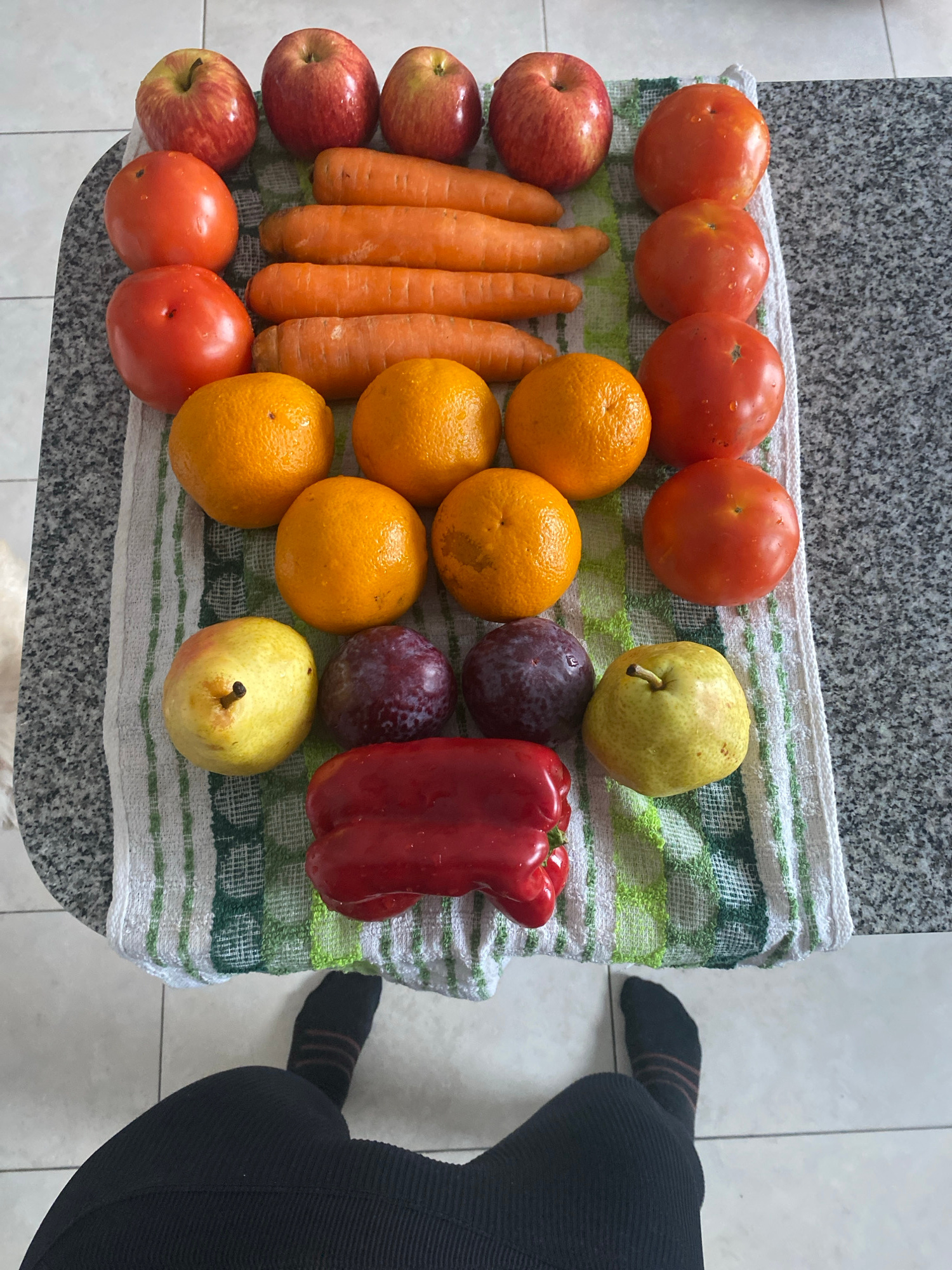 A top-down view shows various fruits and vegetables arranged on a green and white striped towel on a gray surface. The arrangement includes four apples, six tomatoes, four carrots, four oranges, two pā¦read more