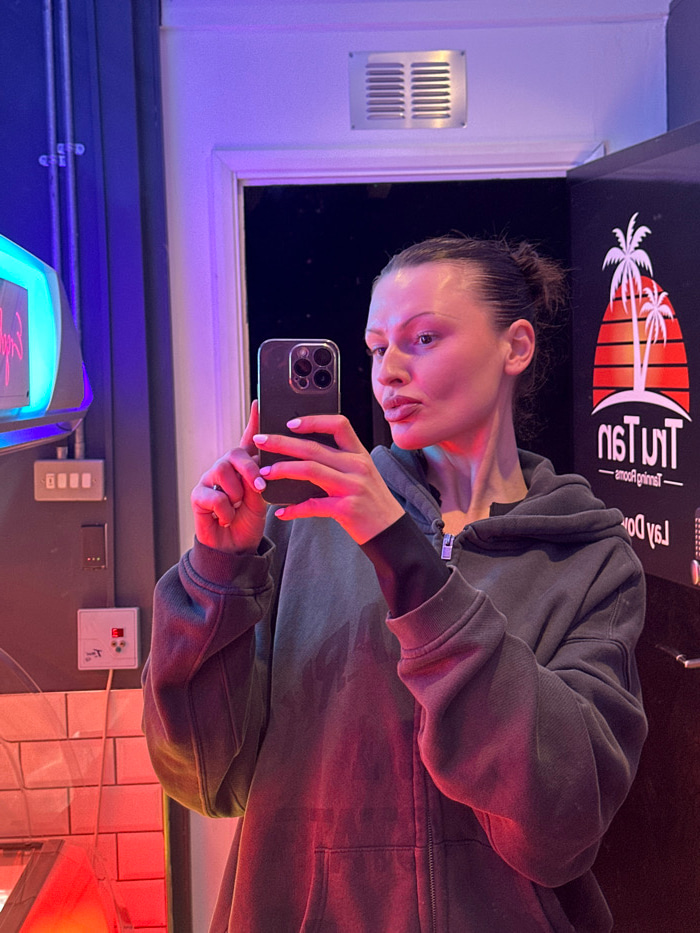 The image displays a person, likely female, taking a mirror selfie in what appears to be an indoor commercial setting, possibly a tanning salon or a similar establishment, given the visible signage. T…read more