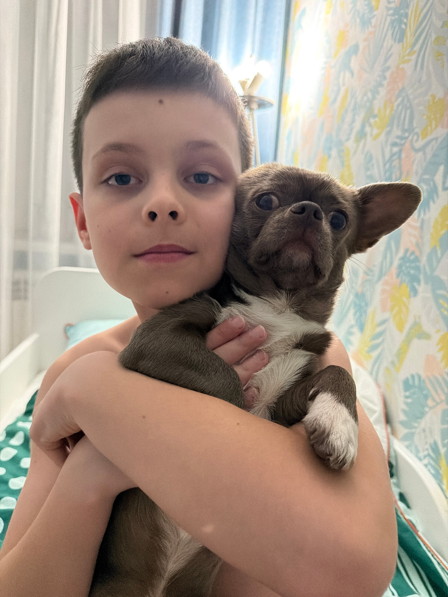 A young boy with short, dark hair and blue eyes is holding a small dog close to his face. The dog, which appears to be a Chihuahua mix, is brown and white. The boy is looking directly at the camera wi…read more
