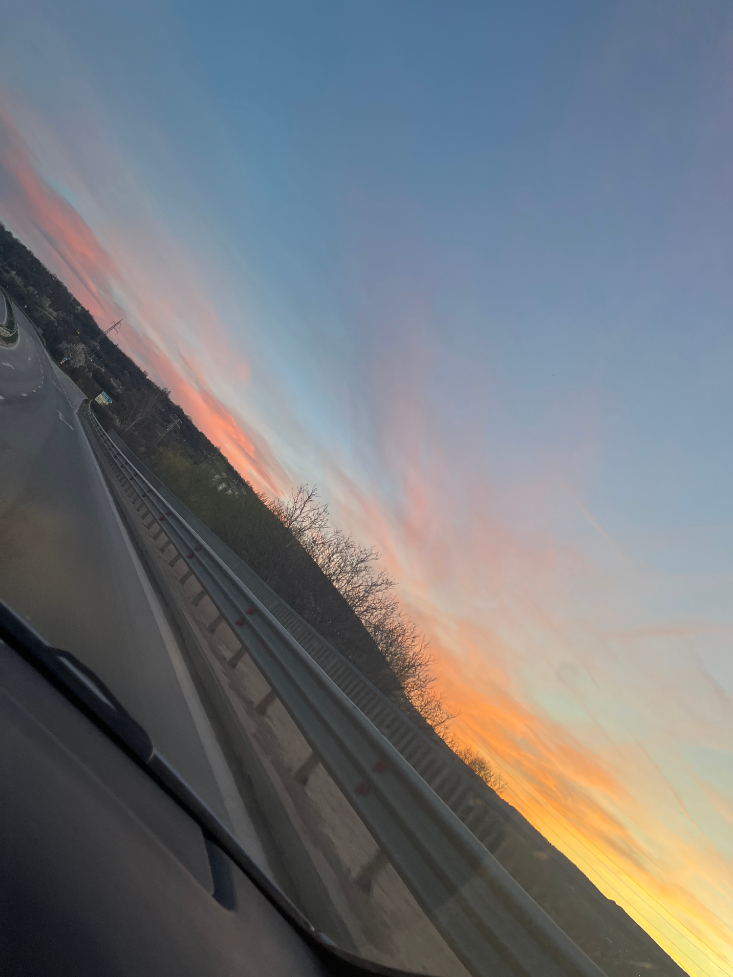 The image shows a view from inside a vehicle, likely a car, driving on a highway near Lovech, Bulgaria. The road curves to the left and is lined with a metal guardrail. Beyond the guardrail is a hills…read more
