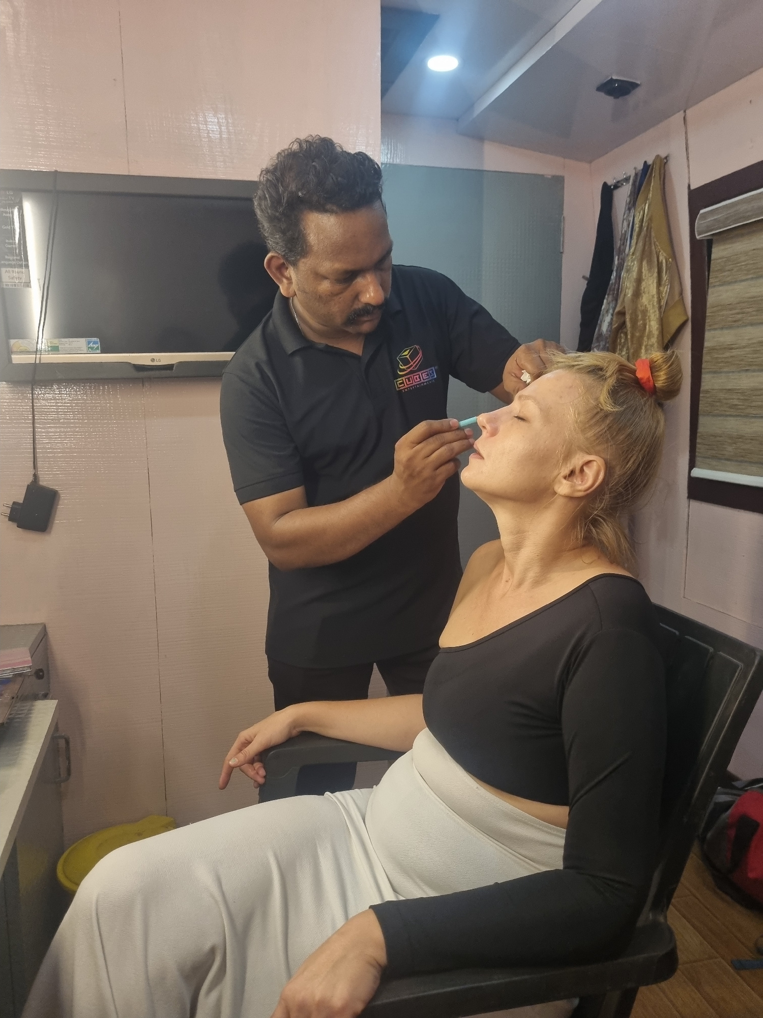 The image captures an indoor scene, likely in a salon or studio in Kalamassery, India, where a man is performing an activity on a seated woman. The main subjects are a man and a woman. The man has da…read more