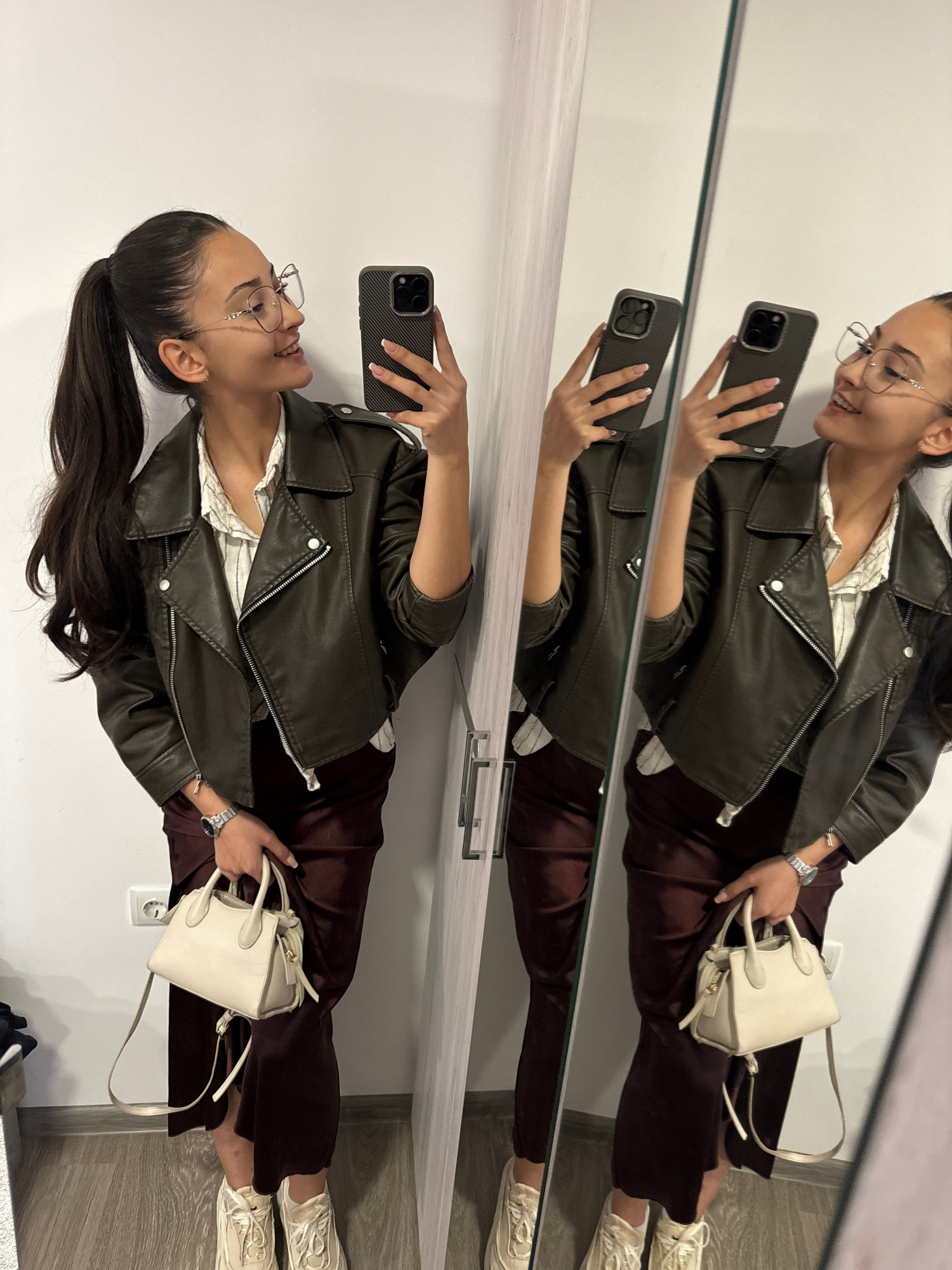 A young woman is standing in front of a full-length mirror, taking a selfie with a smartphone. She is wearing glasses, a white striped shirt, a dark green leather jacket, maroon trousers, and white sn…read more
