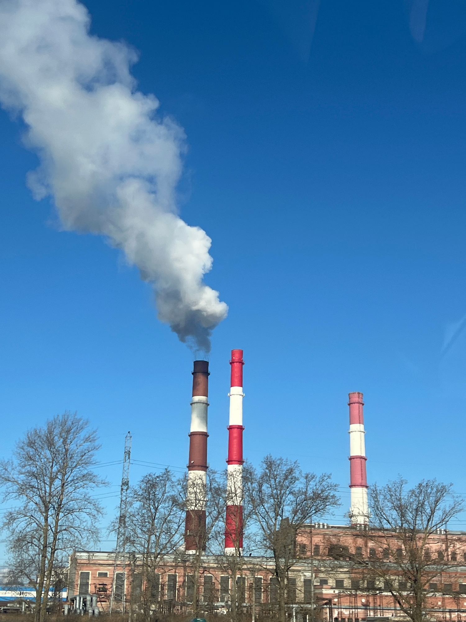 The image shows three smokestacks of a power plant in Saint Petersburg, Russia, against a clear blue sky. From one of the smokestacks, white smoke is billowing out. The smokestacks are painted with al…read more