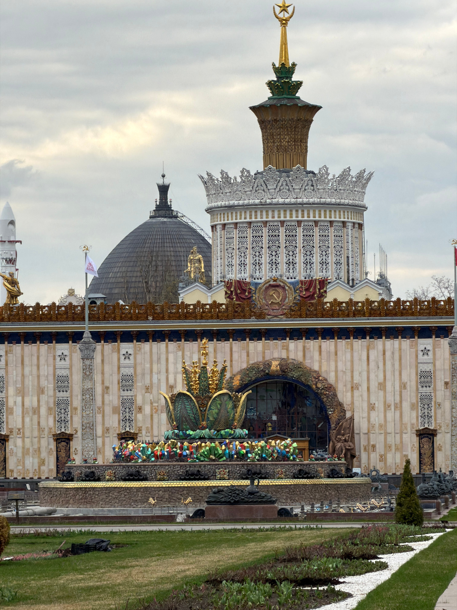The image displays a grand architectural complex, likely a pavilion within a park or exhibition grounds, viewed under an overcast sky. The dominant structure on the right features a tall, golden spire…read more