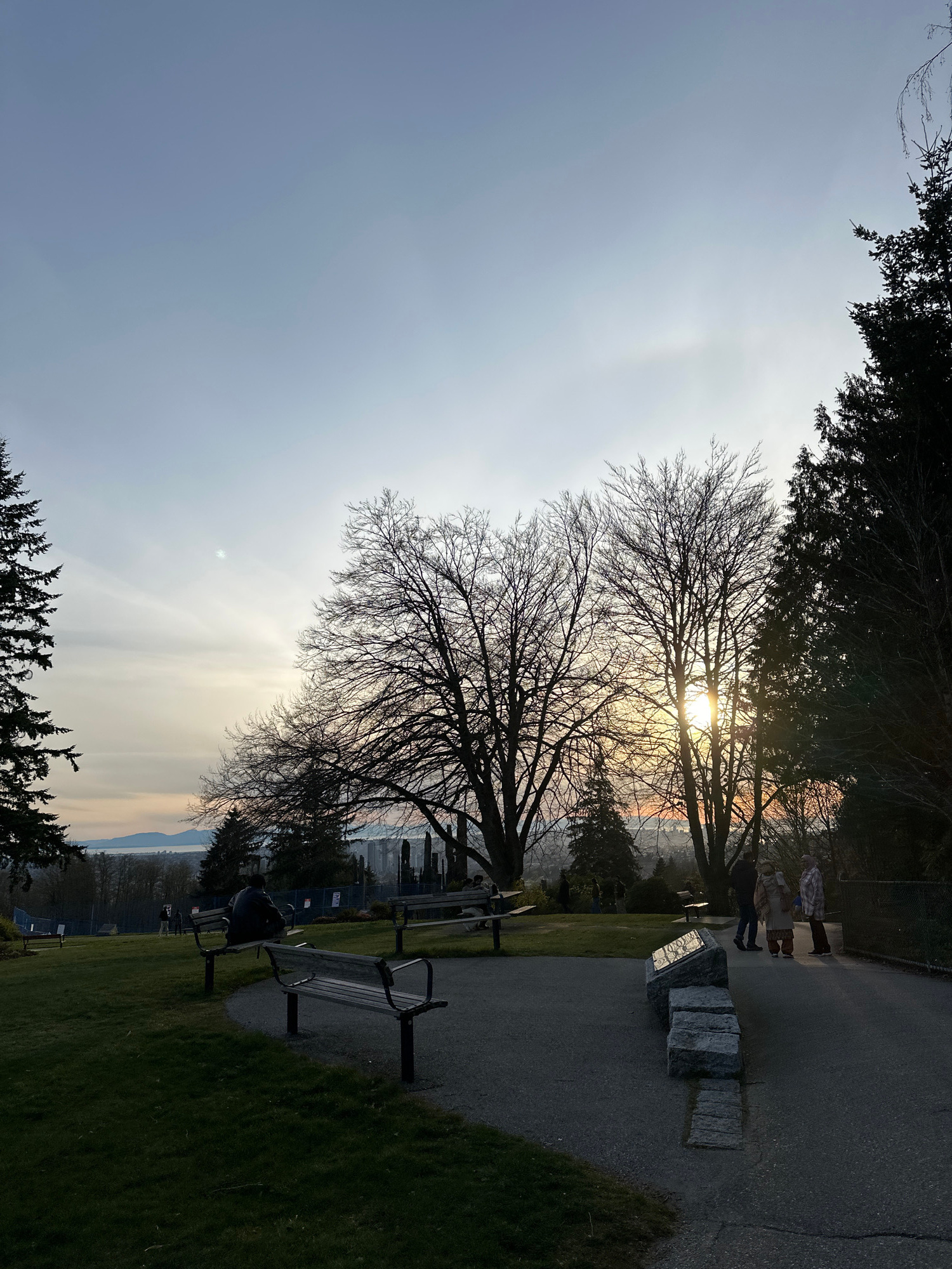 The image depicts an outdoor scene in Burnaby, Canada, likely a park setting at dusk or dawn. Two bare trees dominate the central view, with the sun partially obscured behind them, casting a golden gl…read more