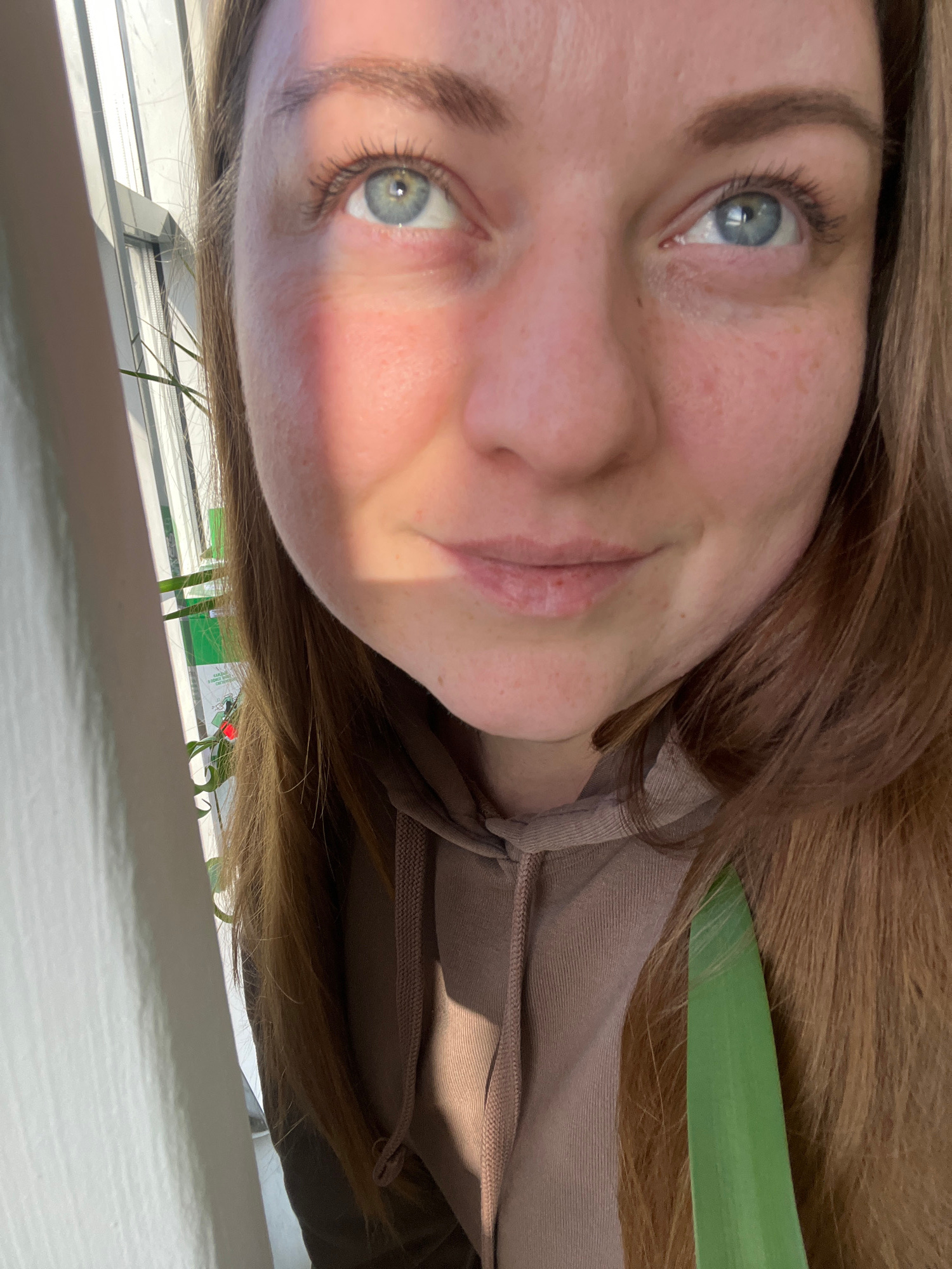 An image, rotated 90 degrees clockwise, captures a close-up of a woman's head and upper torso. The woman has long, light brown or auburn hair, styled loosely around her shoulders. Her blue-grey eyes a…read more