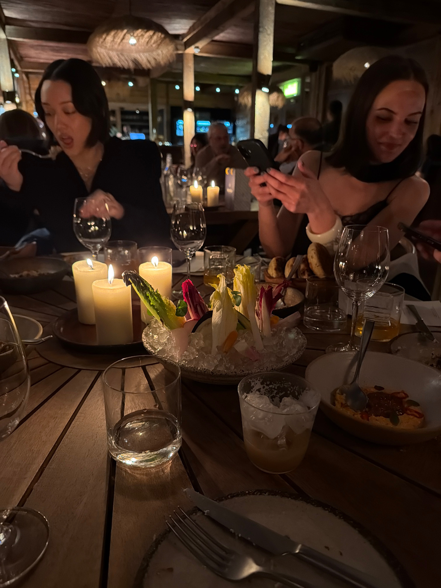 The image depicts a group dining in a dimly lit restaurant with wooden tables, likely located in London, United Kingdom. At least two women are visible in the frame, with one actively taking a photo w…read more