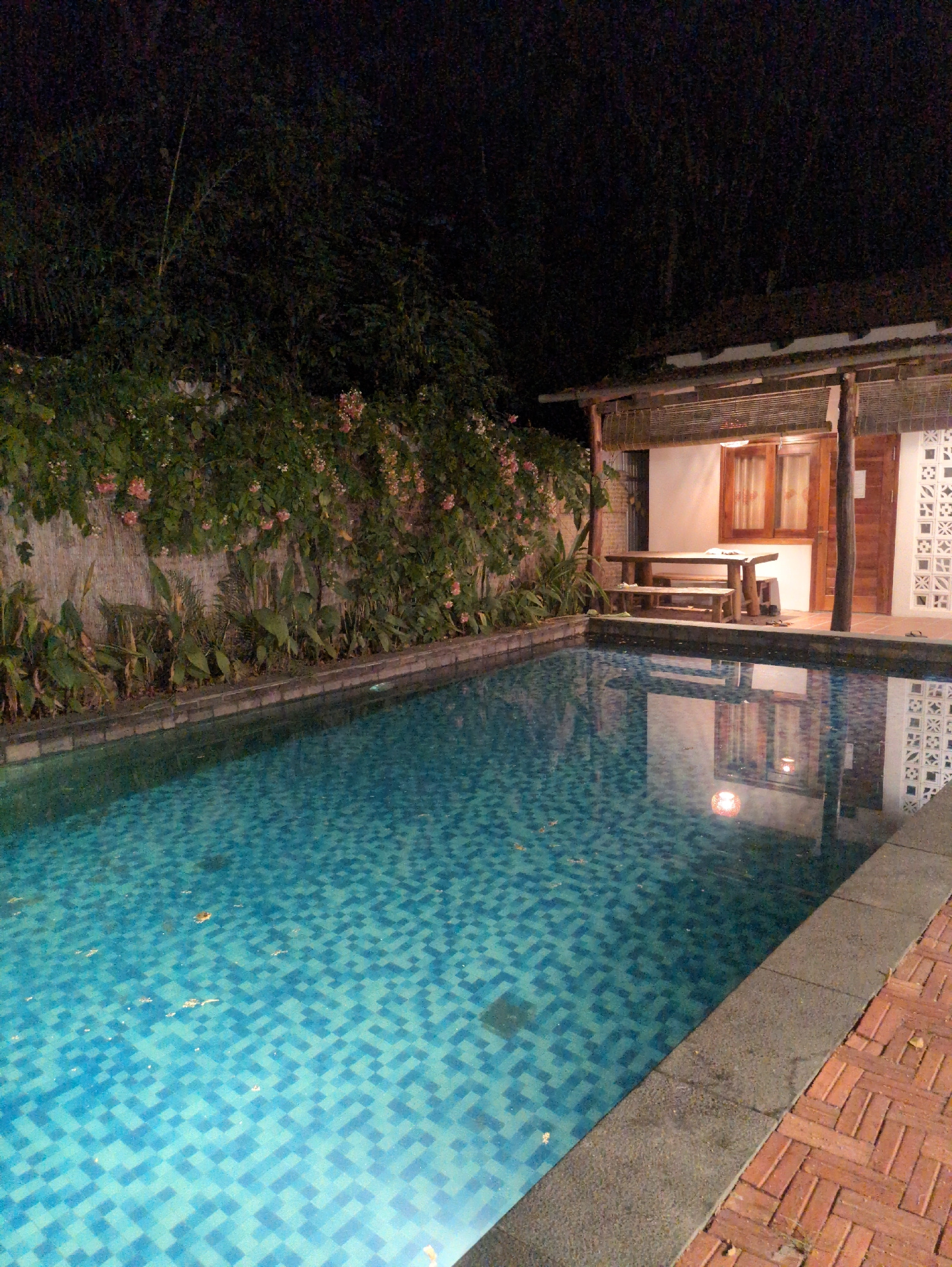 Captured from an elevated vantage point, the scene presents an outdoor setting in Phú Quốc, Vietnam, where a tiled swimming pool meets the edge of a building's exterior, with lush vegetation adjacent.…read more