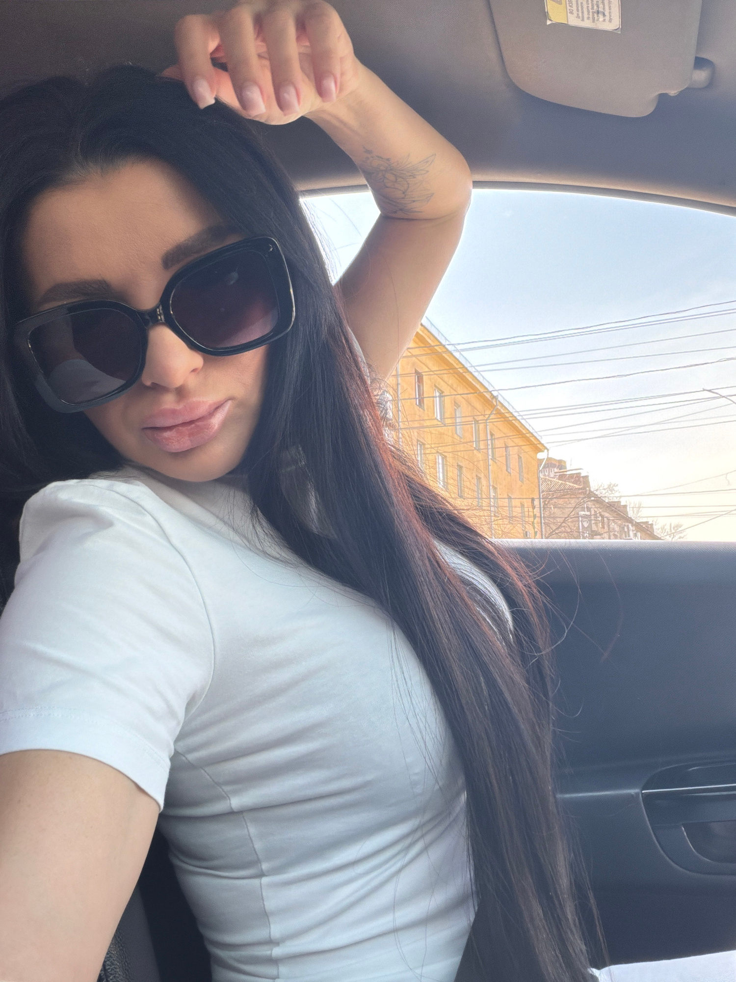 A woman is reclining in a car. She is wearing a white shirt and sunglasses. Her dark hair is spread around her. The background shows a building under construction in Voronezh, Russia. Scaffolding is v…read more