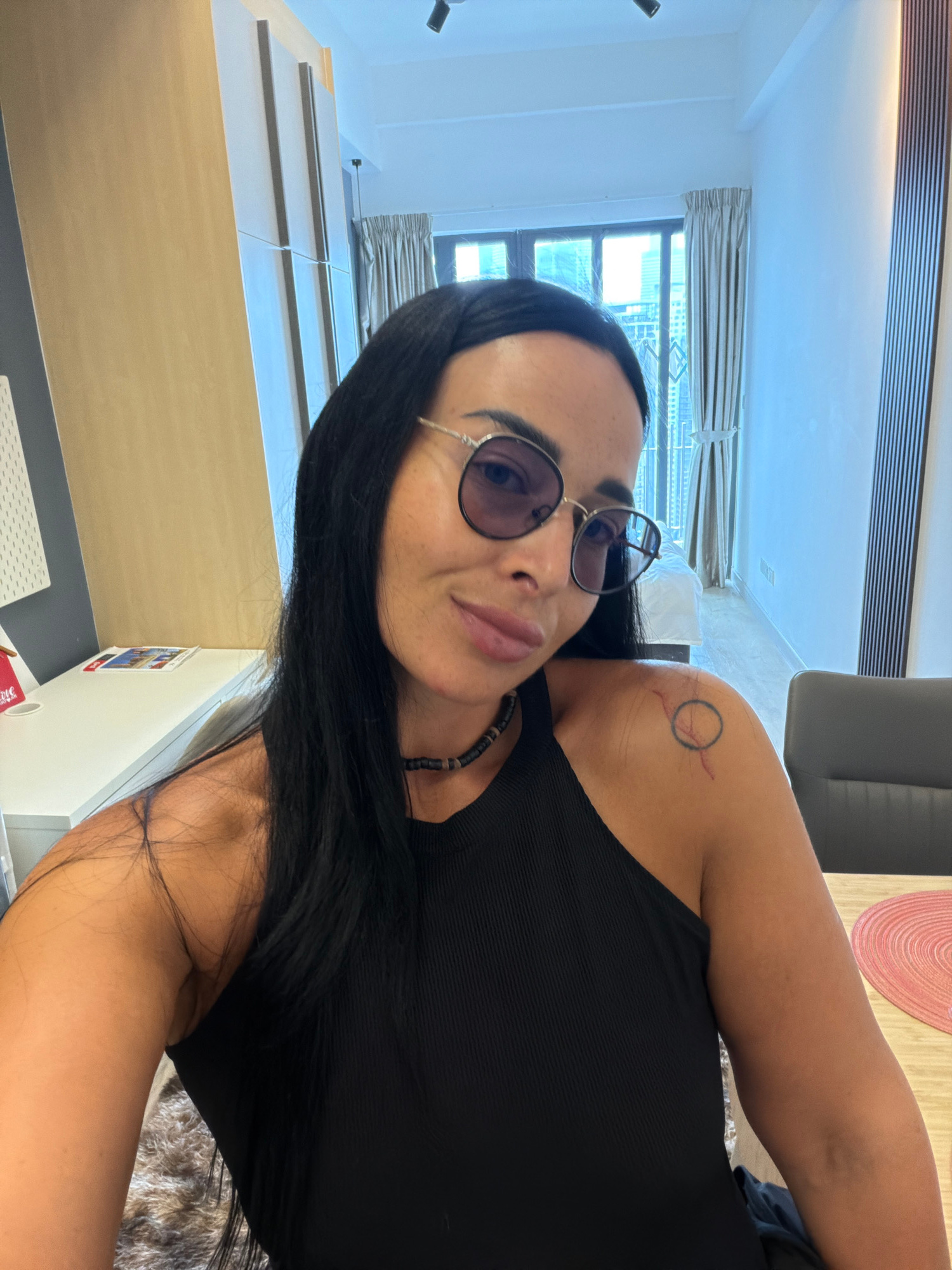 A woman with black hair and sunglasses is posing for a selfie. She is wearing a black top and a necklace. She has a tattoo on her left shoulder. The background shows a room with furniture and curtains…read more