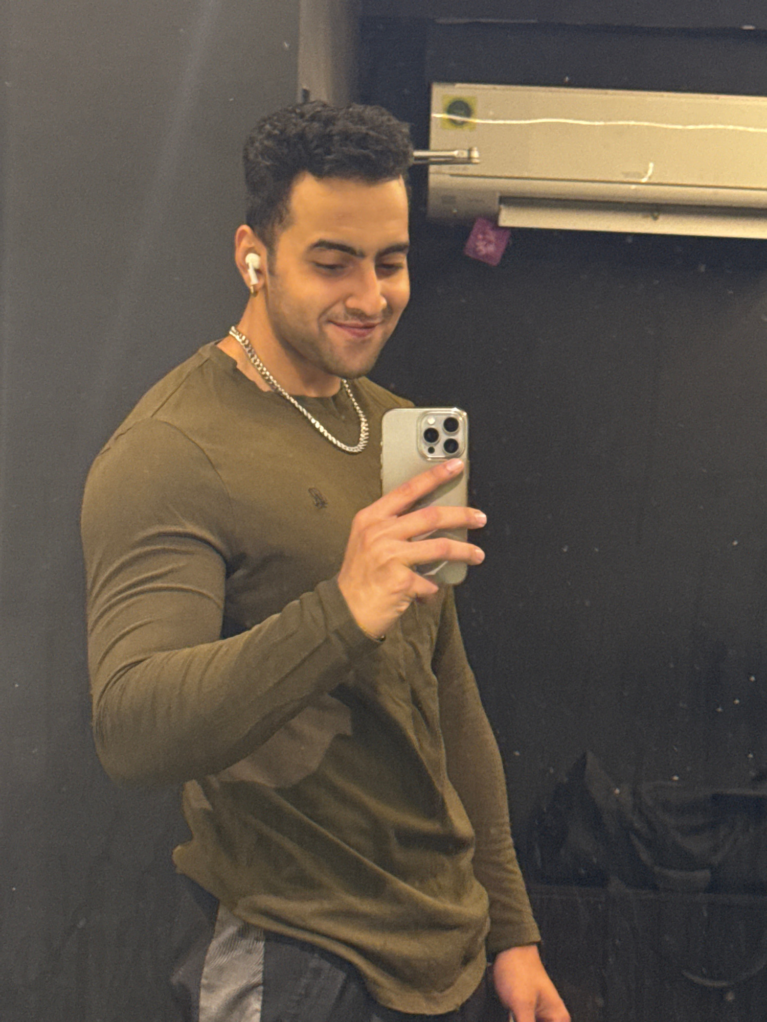 A young adult male, exhibiting apparent South Asian features, is depicted from the waist up in a mirror selfie taken within an indoor setting. He has short dark curly hair and a subtle smile, his gaze…read more