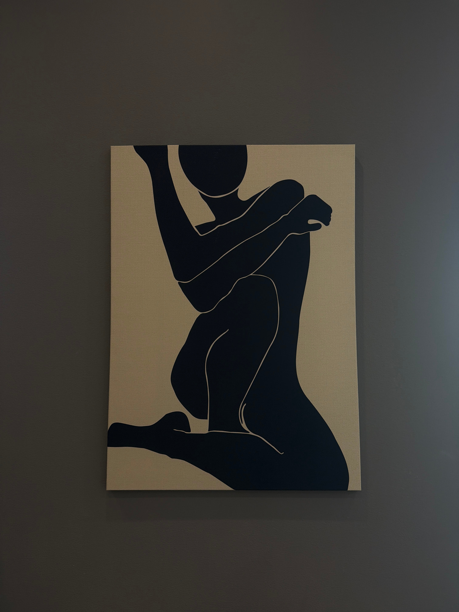 A framed canvas print hangs on a dark gray wall. The artwork depicts two figures in a modern, minimalist style. The figures are rendered in solid black against a tan or beige background. Their bodies…read more