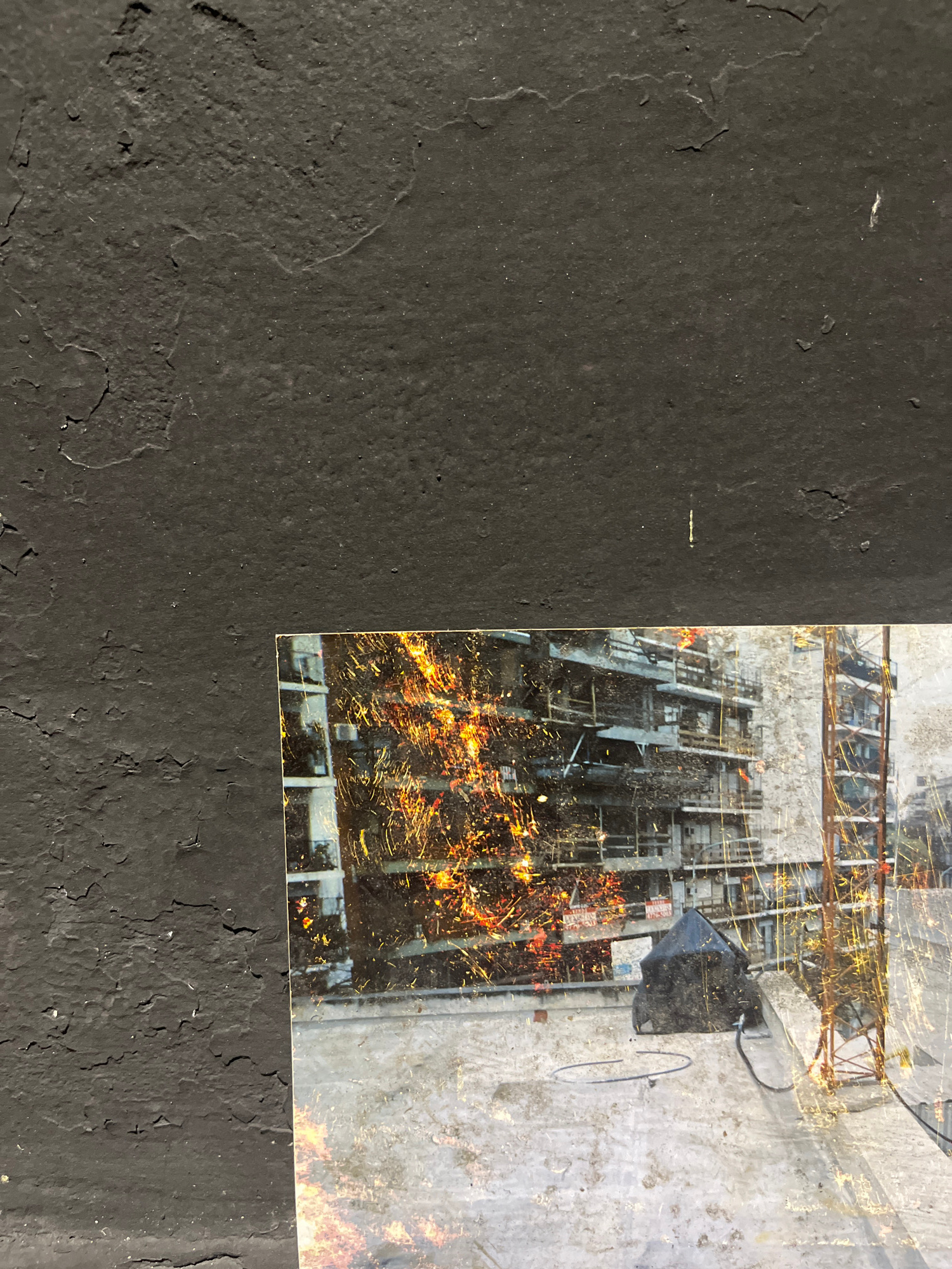 A photograph shows a portion of a heavily textured, black wall with peeling paint occupying approximately half the frame on the left side. Affixed to the wall is a rectangular, glossy photograph with…read more