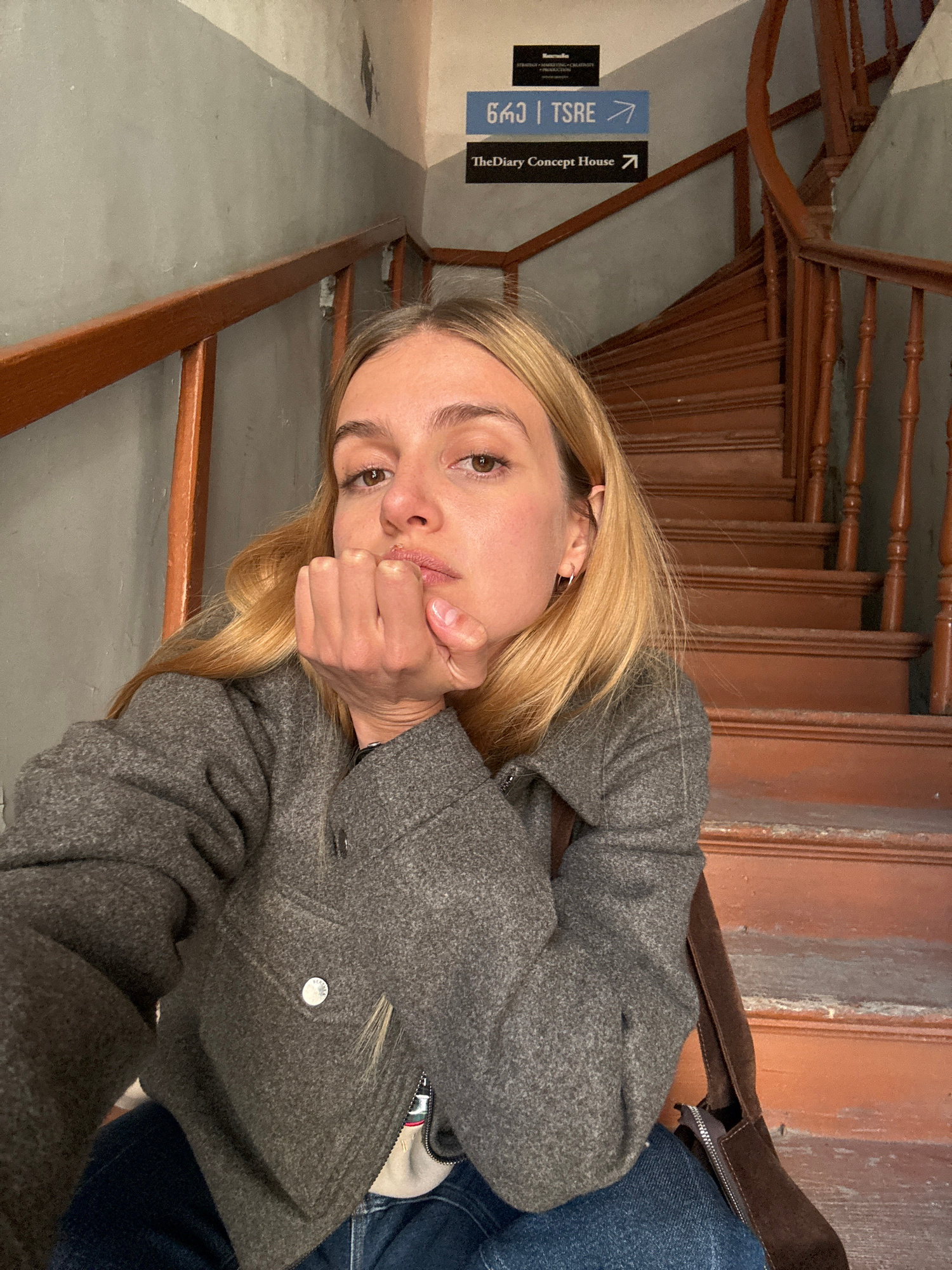 The image shows a blonde woman sitting on a wooden staircase, possibly in Tbilisi, Georgia, based on the presence of a sign that says "TheDiary Concept House" and "643 Tsre". The woman wears a grey co…read more