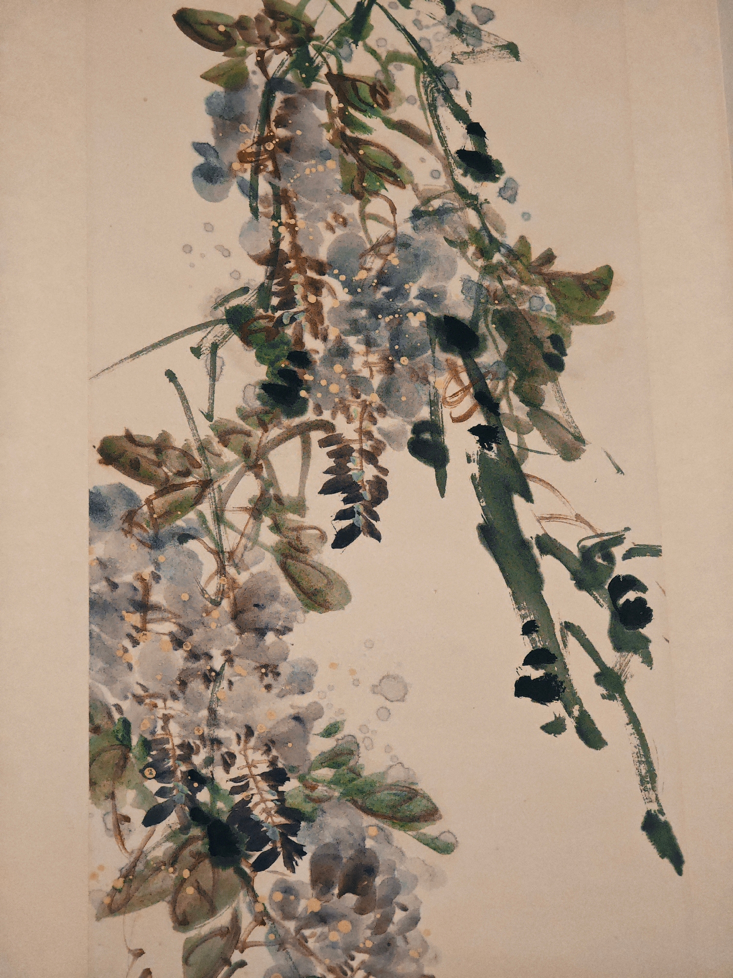 The image displays a vertical close-up of a traditional East Asian ink wash painting, depicting flowering wisteria branches and foliage. The artwork is characterized by dynamic brushstrokes and varied…read more