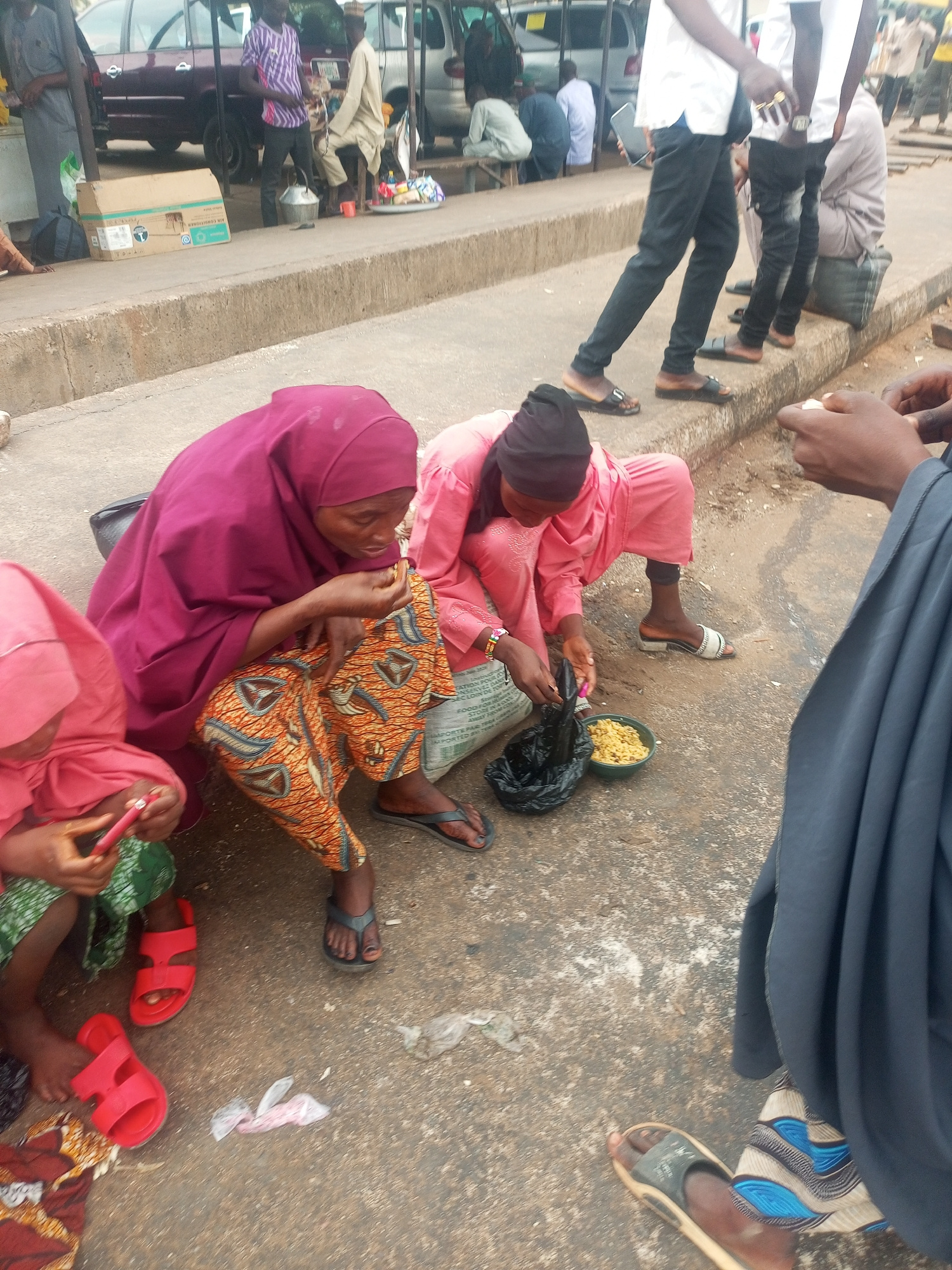 In Gombe, Nigeria, several individuals are situated near a roadside. Two women, dressed in pink and maroon hijab, are seated on the ground. The woman in pink is holding a black plastic bag. Beside theβ¦read more