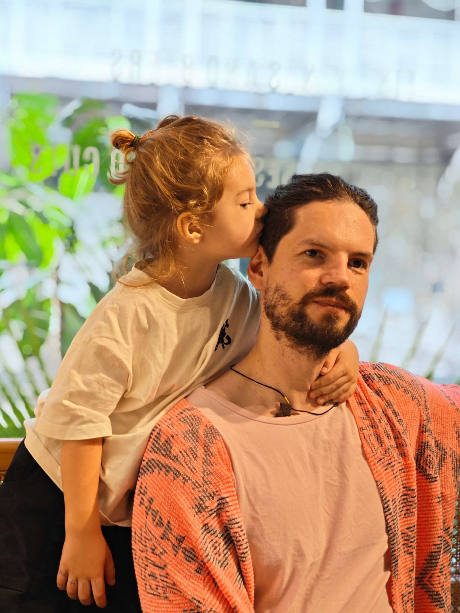 A medium, color shot shows a young Caucasian girl kissing a bearded Caucasian man on the head. The girl has blonde hair in a bun and is wearing a light-colored t-shirt and dark shorts. The man has medβ¦read more
