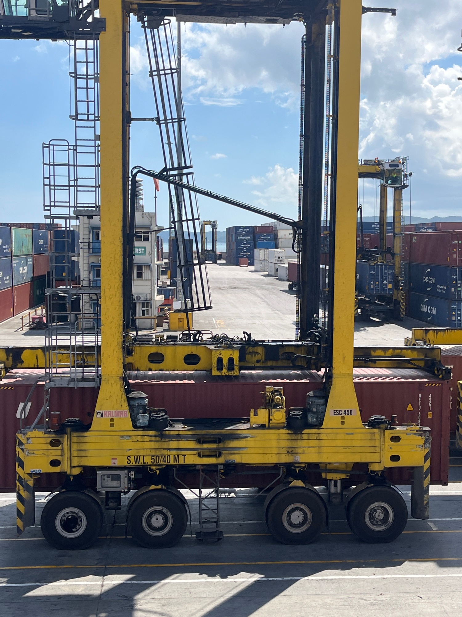The image shows a port area with a large, yellow straddle carrier in the foreground. It appears to be a bright, sunny day. Numerous shipping containers, stacked in rows, can be seen in the background,…read more