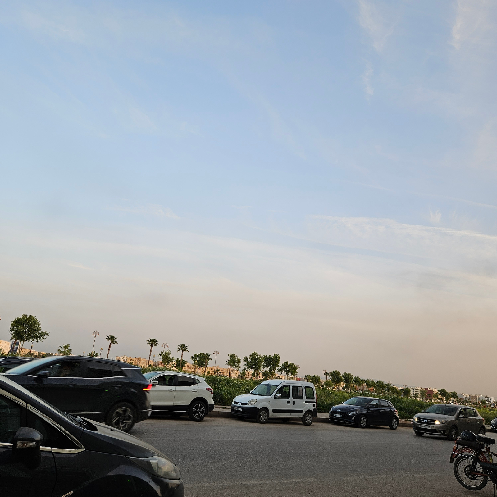 The image shows a street scene in Fez, Morocco, with several cars parked along the side of the road. The sky is visible, with a mix of blue and hazy colors. Palm trees and buildings line the street inβ¦read more