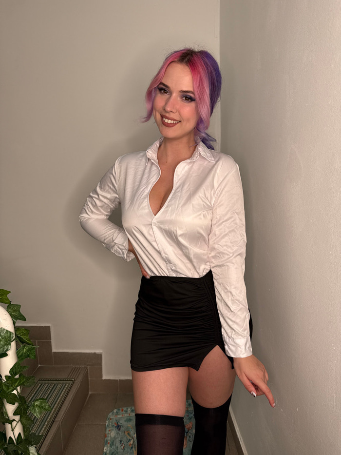 A female subject is depicted standing in an indoor setting, identified as the City of Zagreb, Croatia. She has split-dyed hair, pink on the frontal and top sections, and purple on the rear and underne…read more