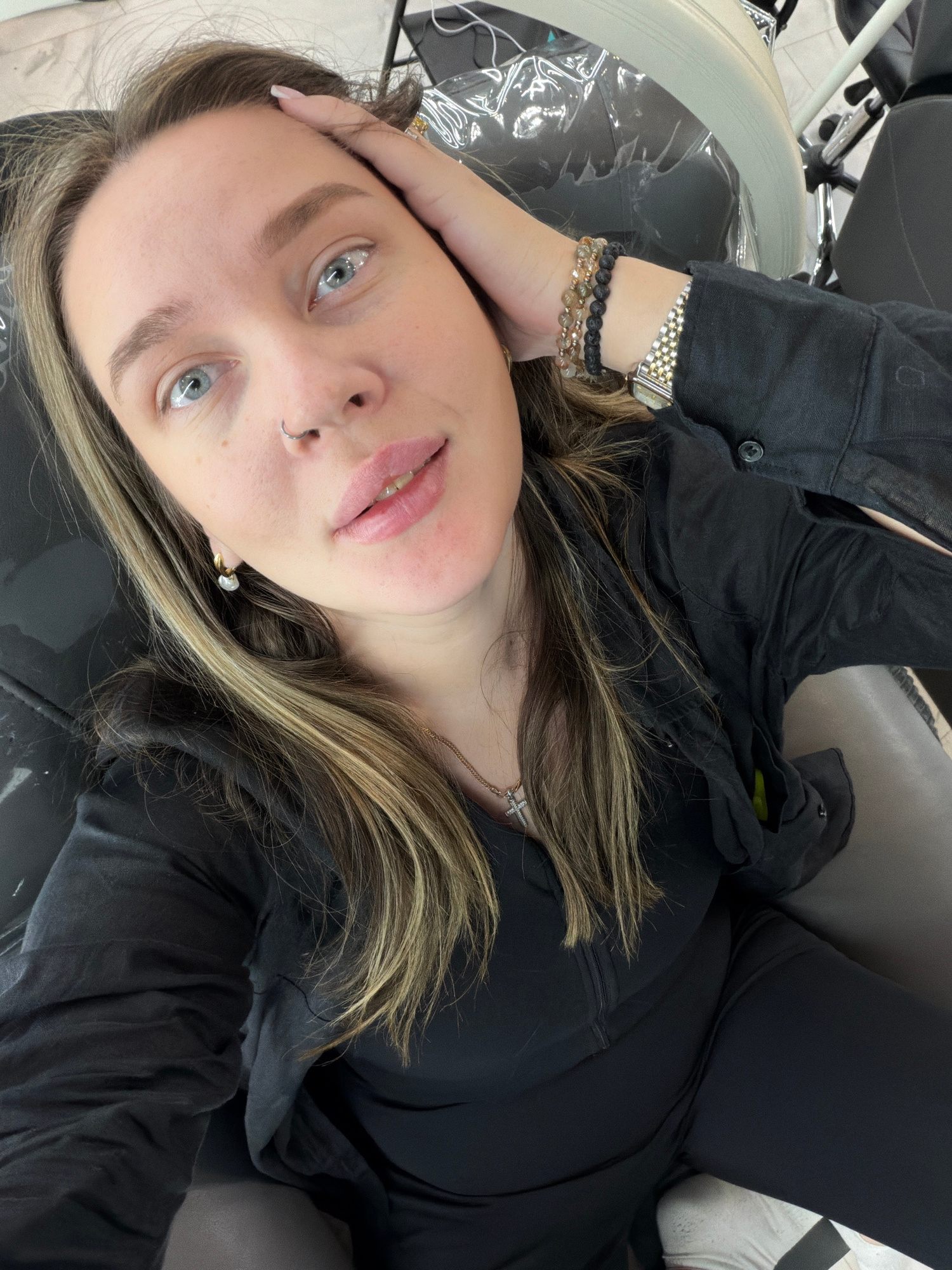 The image is a selfie-style photograph of a fair-skinned individual with light blue eyes and blonde hair with darker roots. They are wearing a black button-down shirt and black pants. A silver nose ri…read more
