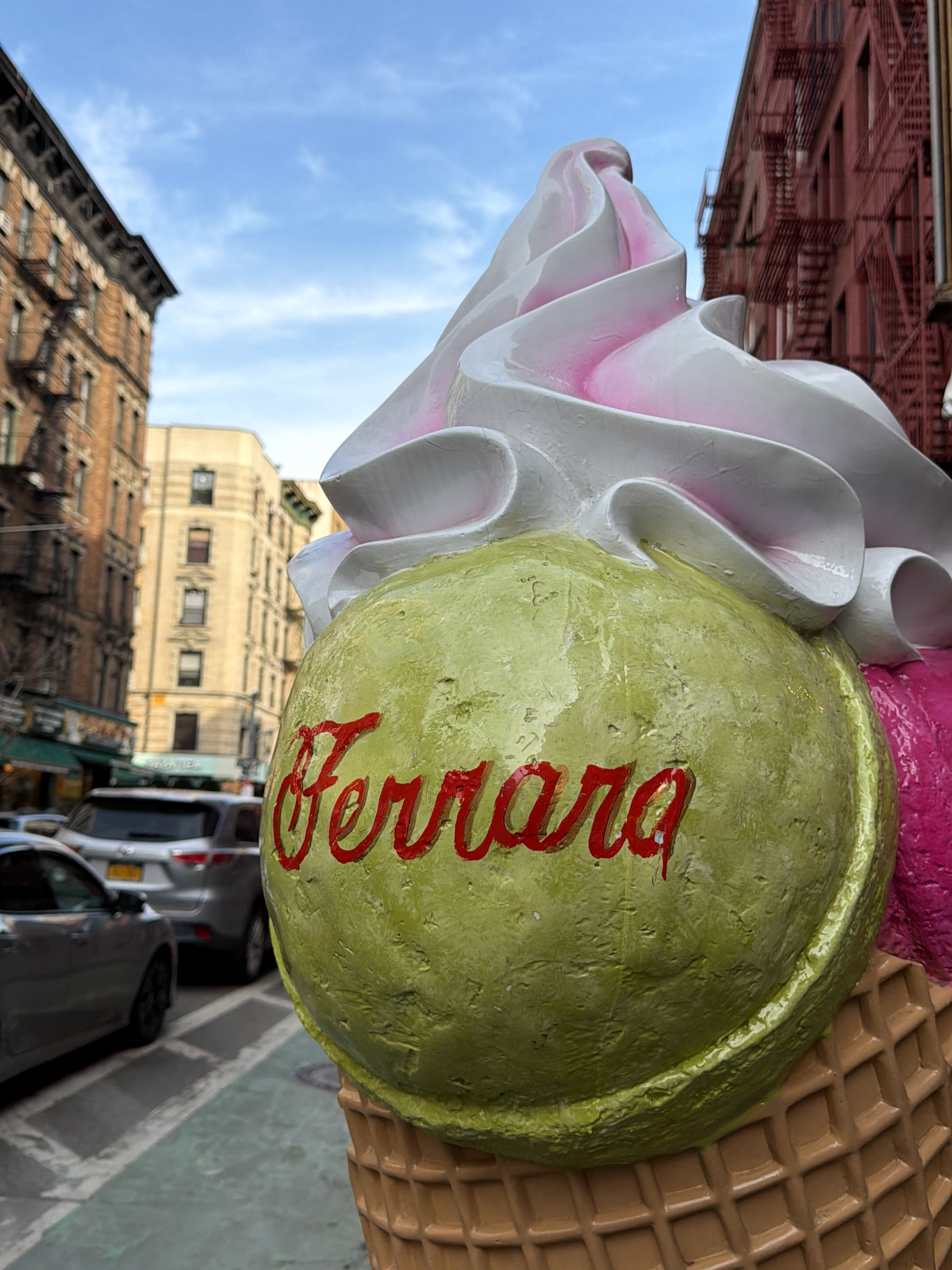 The image depicts a large, colorful ice cream sculpture on a street in New York City, United States. The sculpture features a waffle cone base, with scoops of pistachio-green and raspberry-pink ice cr…read more