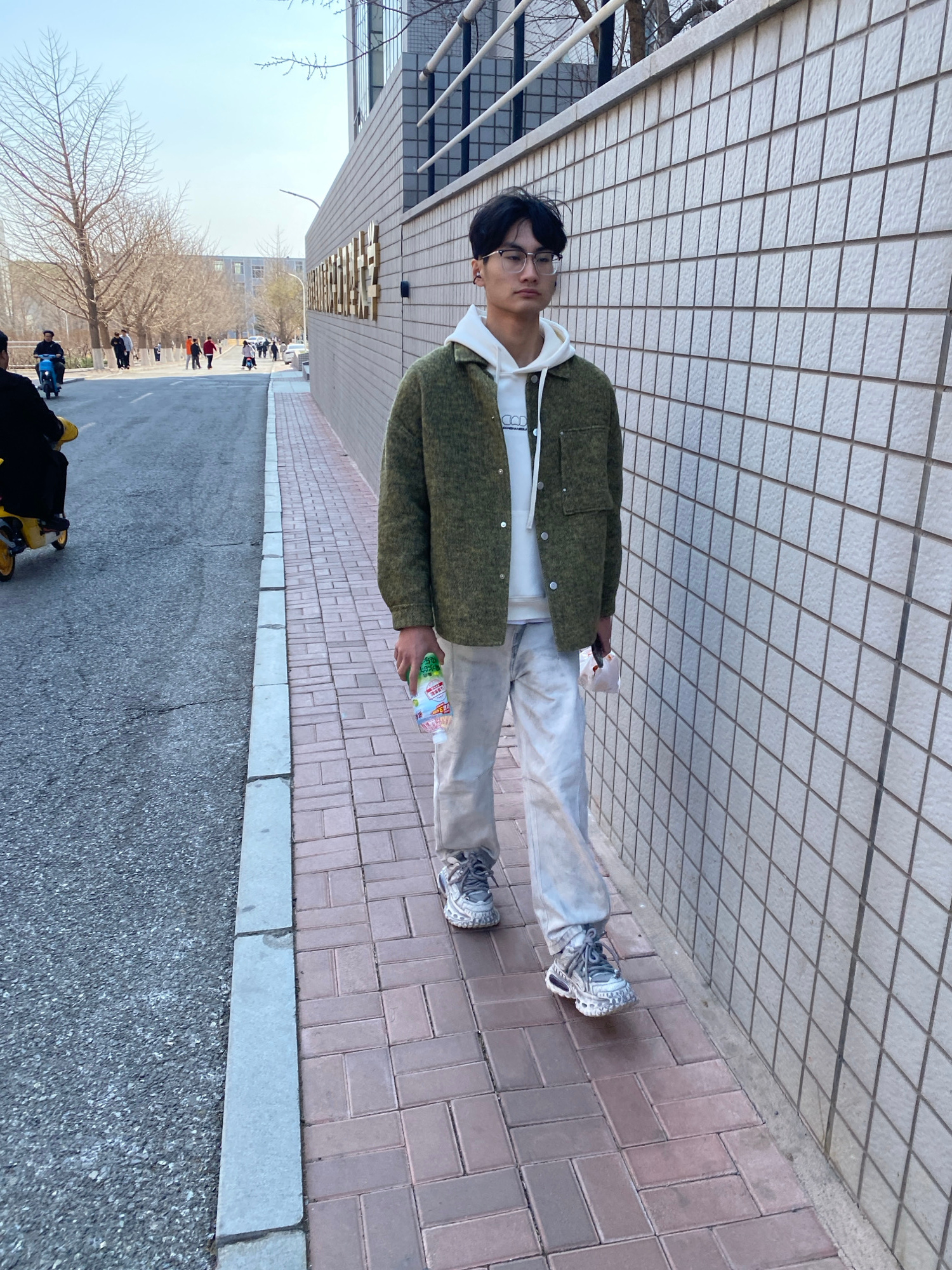 A young man stands on a brick sidewalk in Zhongtun, China. He wears glasses, a white hoodie, an olive green jacket, and light-colored pants with grey sneakers. He holds a bottled drink. Behind him is…read more