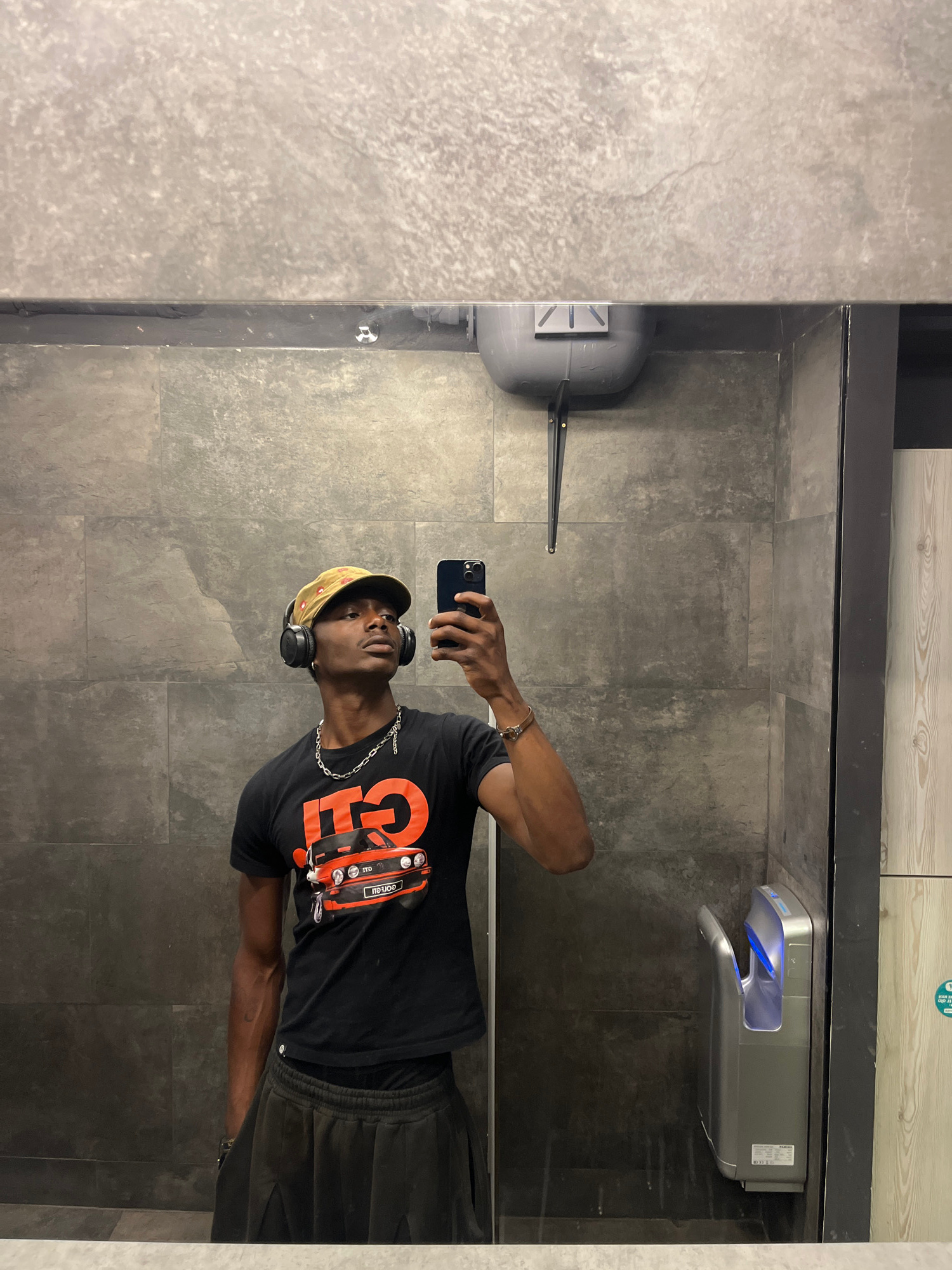 A man is taking a selfie in a bathroom. The man is wearing a black t-shirt, dark sweatpants, a camouflage baseball cap, and black headphones. He also has a silver chain and a bracelet. The bathroom ha…read more