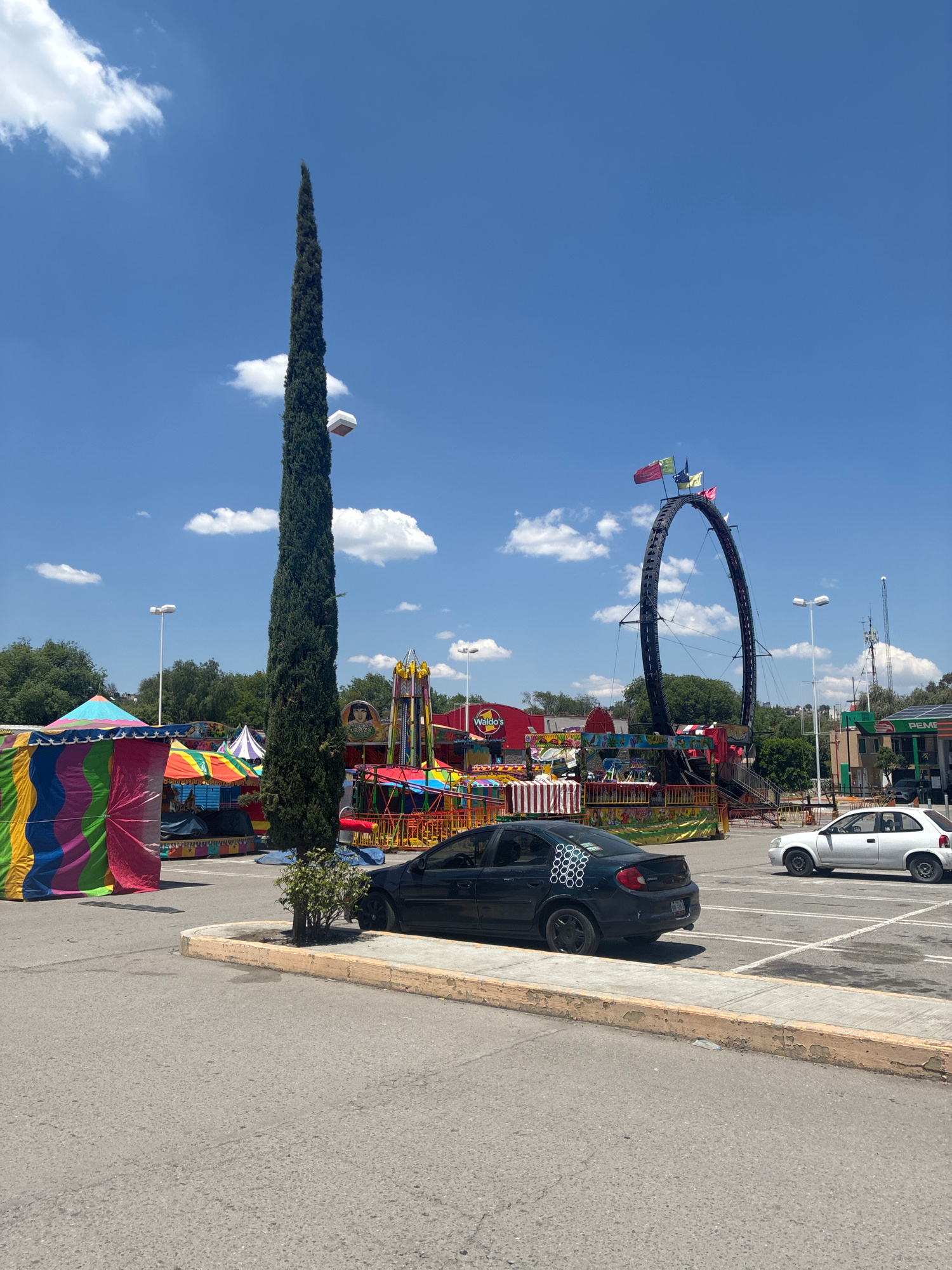 A daytime, outdoor, angled shot depicts a carnival adjacent to a parking lot in Tepeji de Ocampo, Mexico. The sky is blue with scattered clouds. A tall, thin tree extends upwards. Carnival rides and t…read more