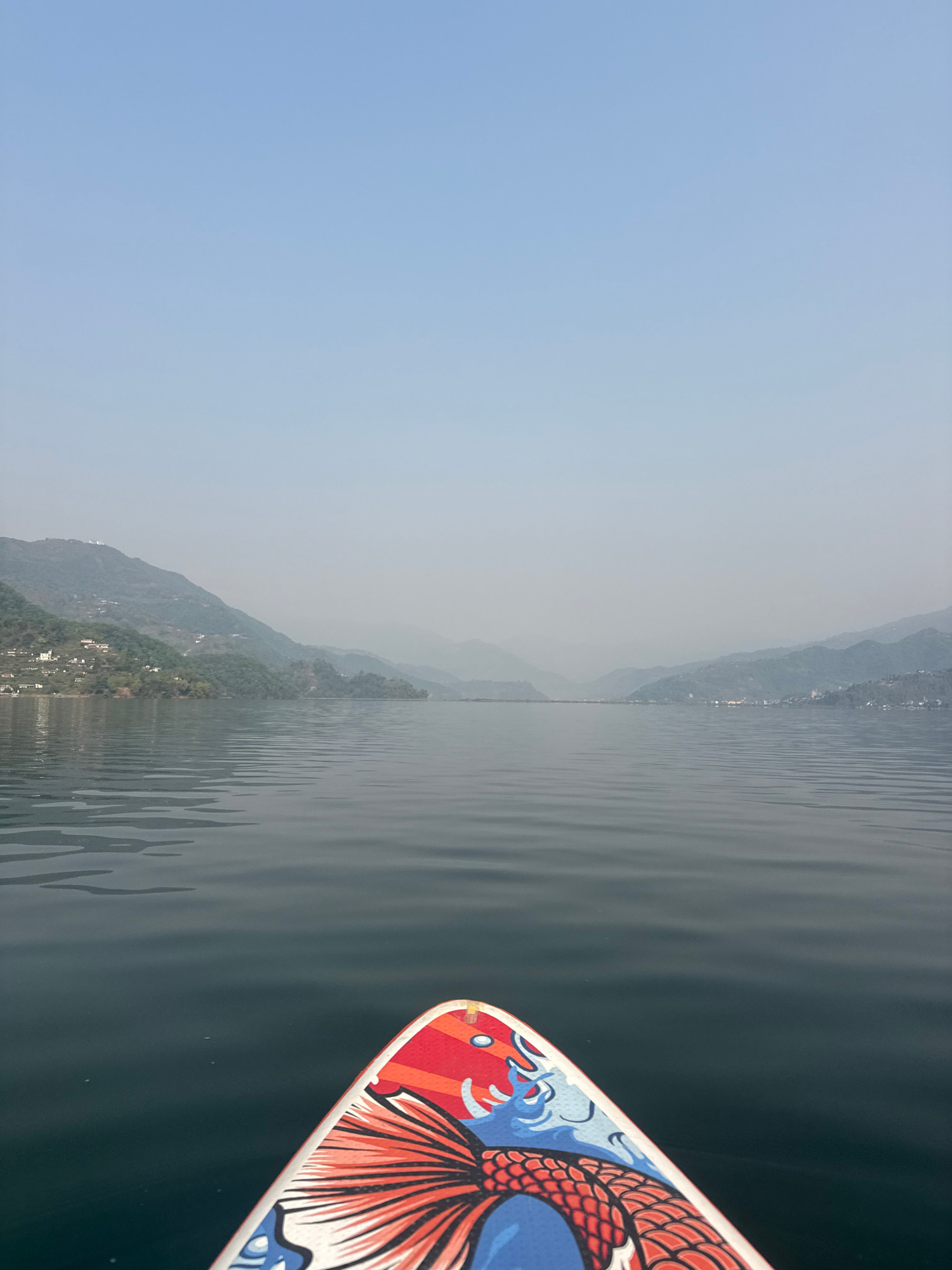 The image shows a view from a boat on Phewa Lake in Pokhara, Nepal. The lake is calm with subtle ripples on the surface. In the distance, the Annapurna mountain range is visible, obscured by haze. A p…read more