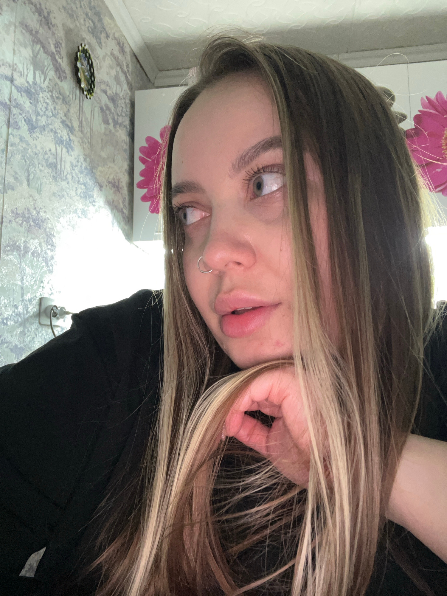 A woman with brown and blonde highlighted hair rests her face on her hand. She has a silver hoop nose piercing. She is wearing a black top. The background shows a patterned floor, a white cabinet with…read more
