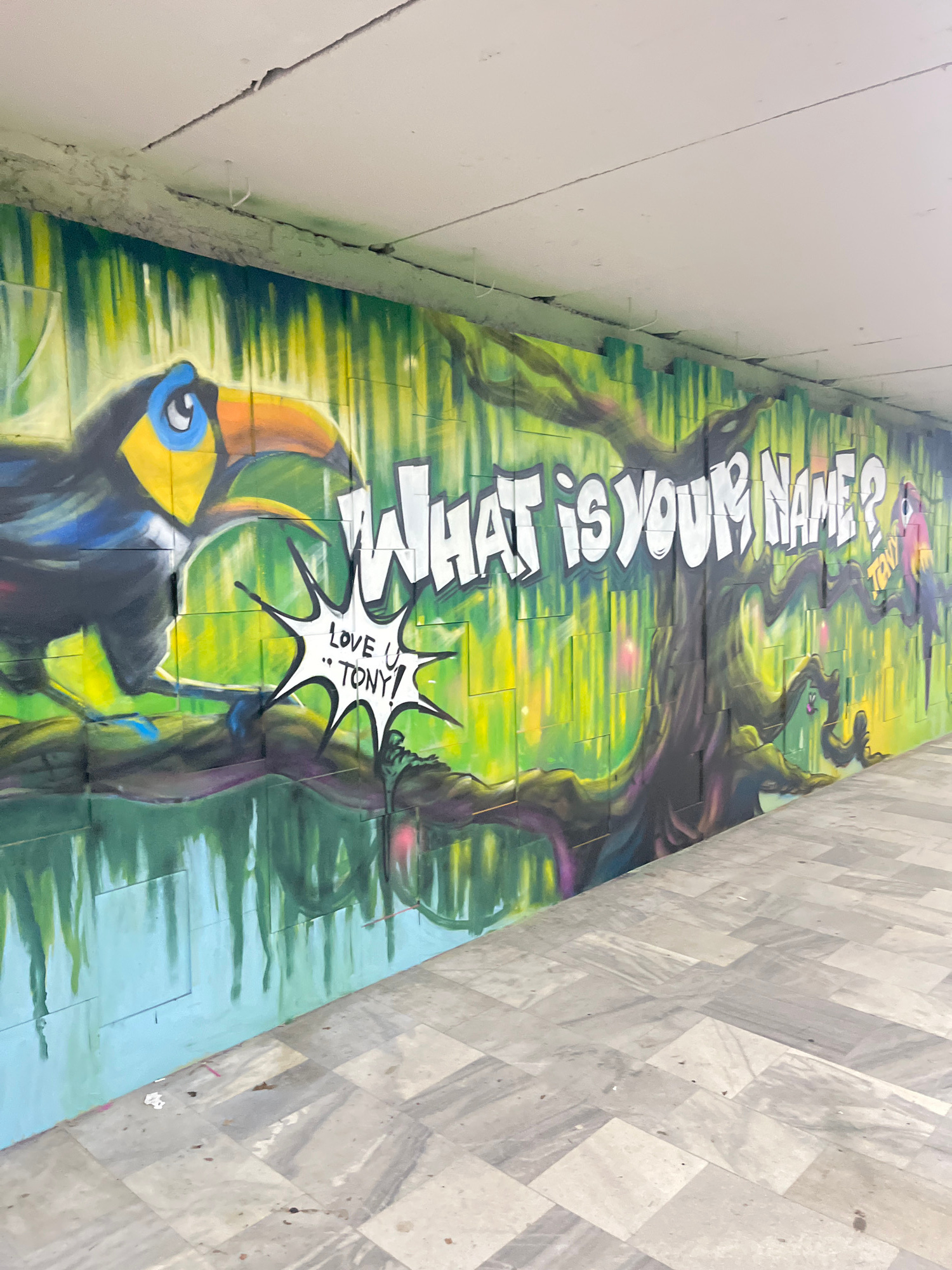 A vibrant graffiti mural transforms a long, vertical wall within what appears to be an urban underpass or sheltered walkway in Sofia, Bulgaria. The artwork depicts a lush, stylized jungle or forest sc…read more