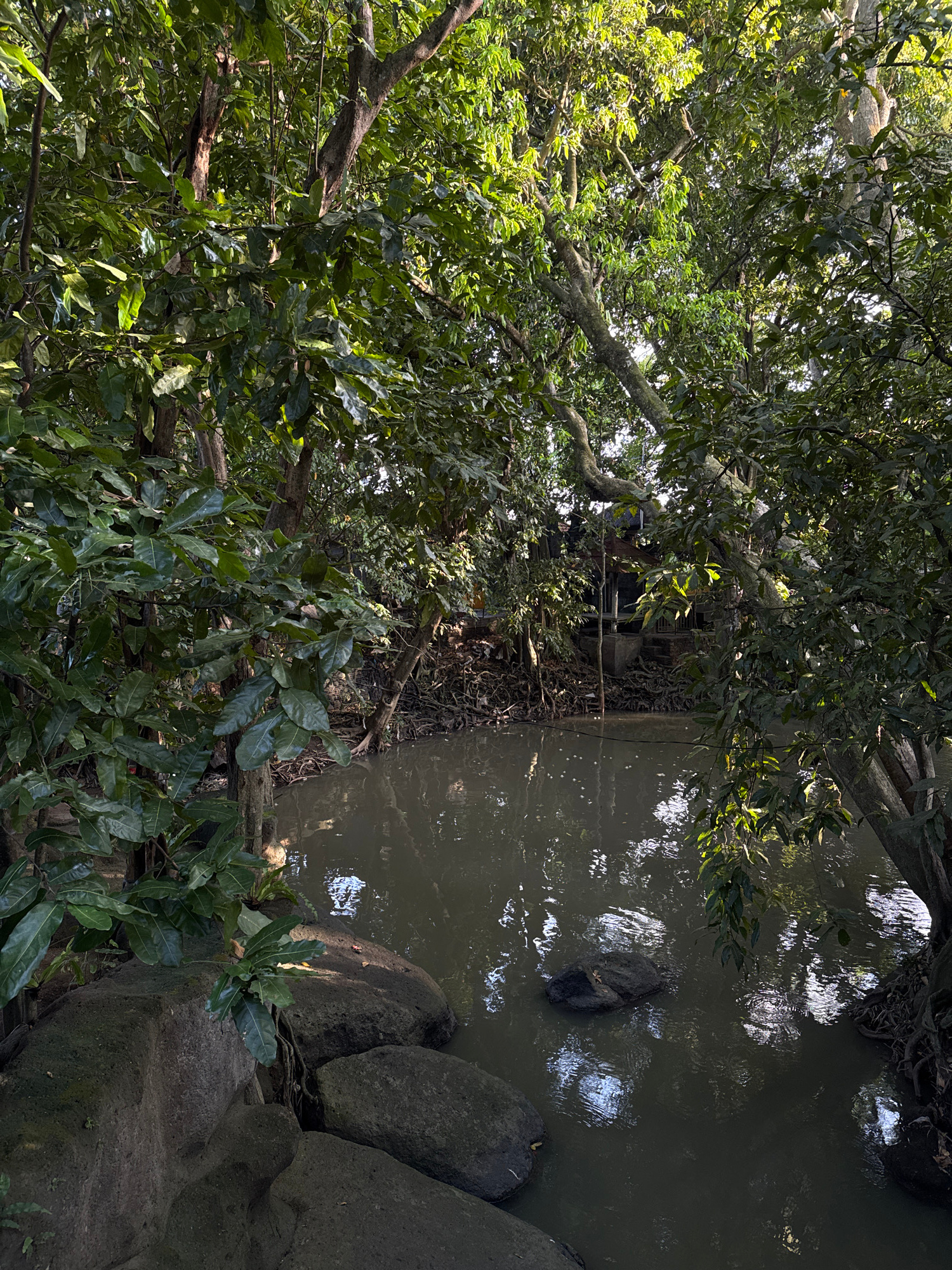 The image depicts a body of water, possibly a stream or pond, surrounded by dense foliage and large rocks. The water is murky, reflecting the light filtering through the trees above. A small structure…read more