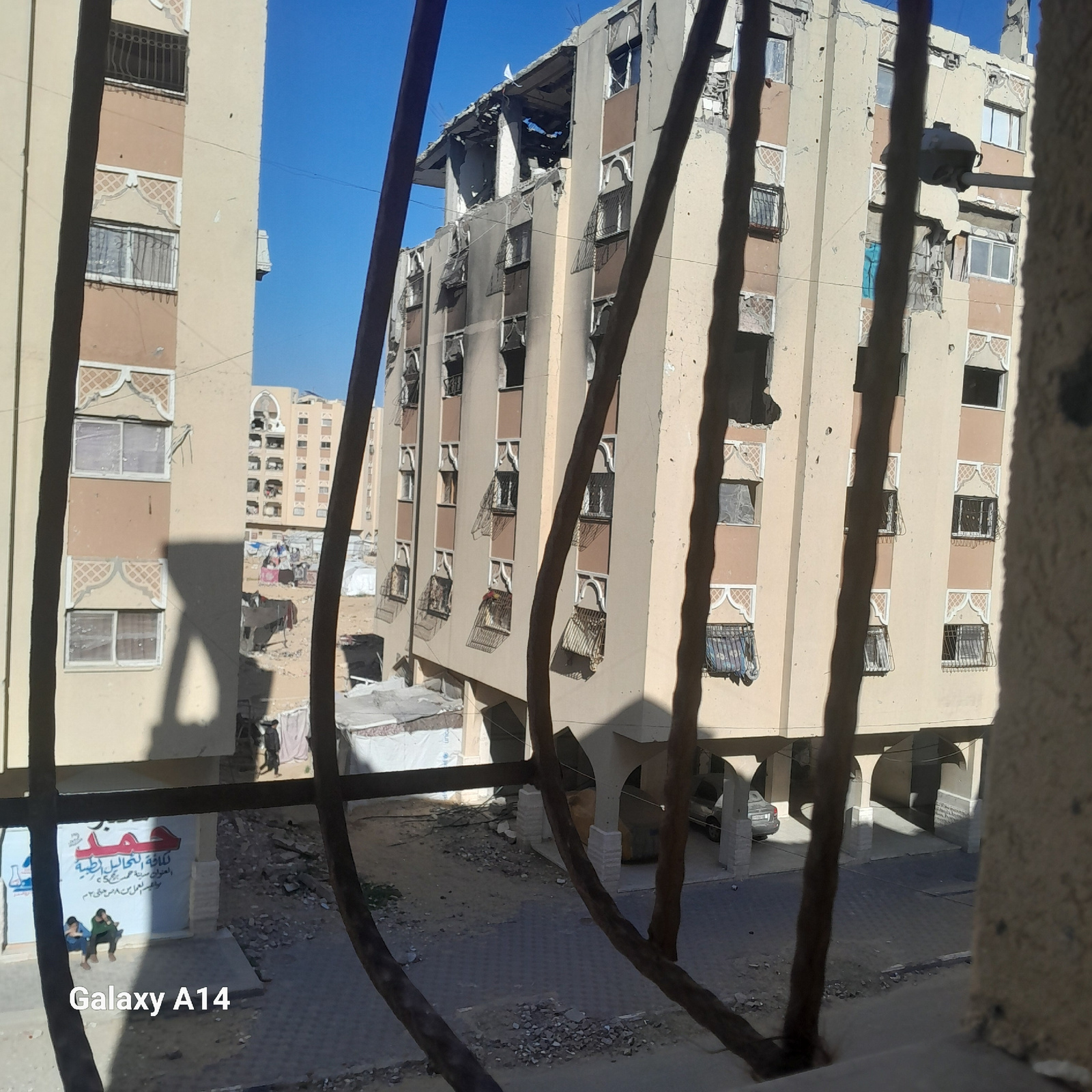 The image shows buildings in Khan Yunis, Palestinian Territory, viewed through a window or balcony railing. The buildings are multi-story, with damage evident on at least one building, including missi…read more