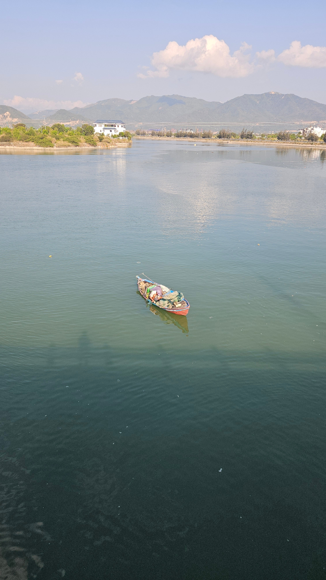 Aerial view of a boat in the Cai River, Nha Trang, Vietnam. The boat is centrally located in the frame and appears to be heavily laden with various items. To the left of the river is the city with mountains in the background. The sky is partly cloudy. The water's surface is generally calm. | Open Wire