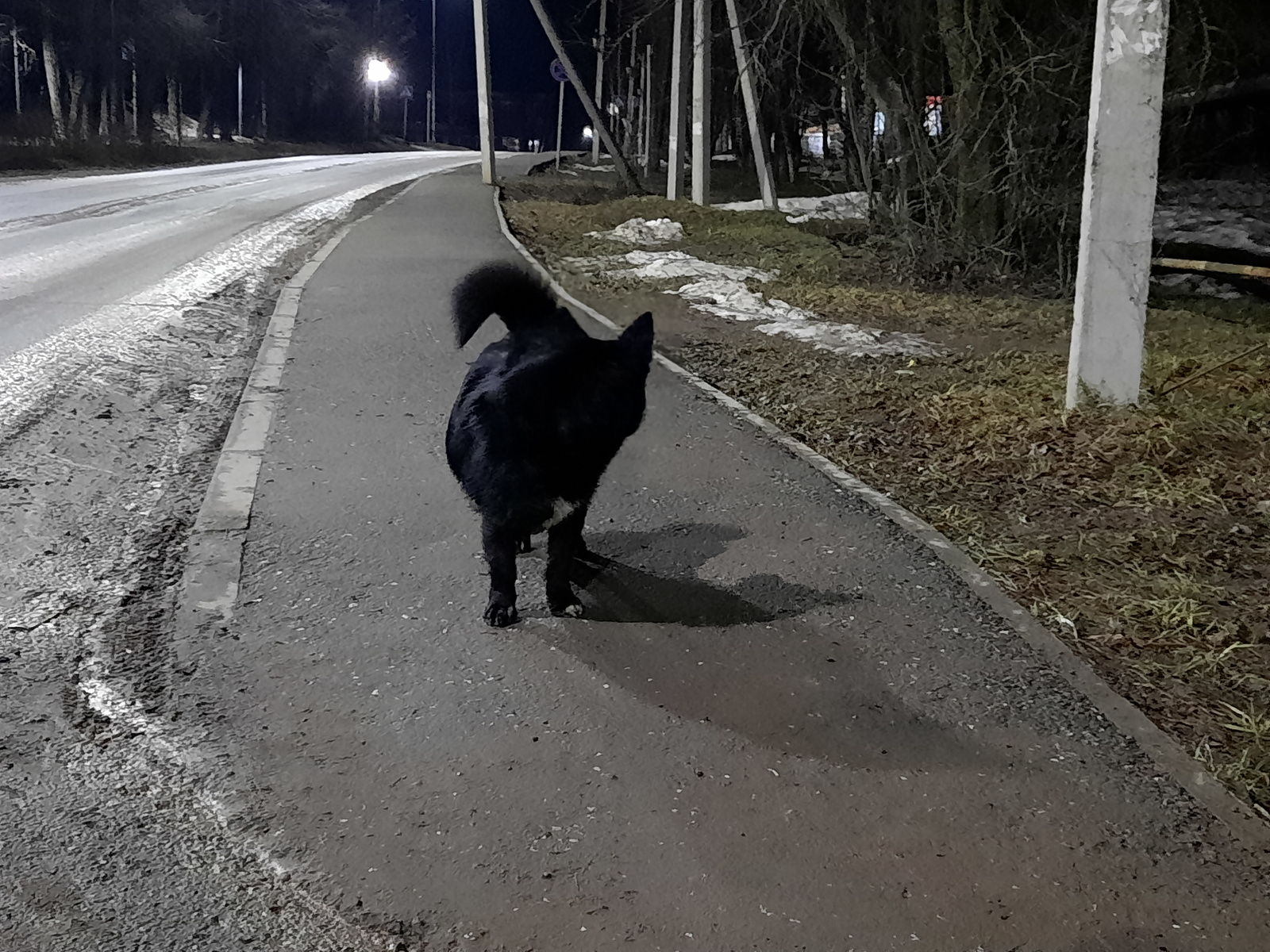 A black dog walks away from the viewer on a sidewalk. The location is Krasnogorskoye, Russia, indicated by the presence of road and street lighting infrastructure typical of urban or suburban areas. T…read more