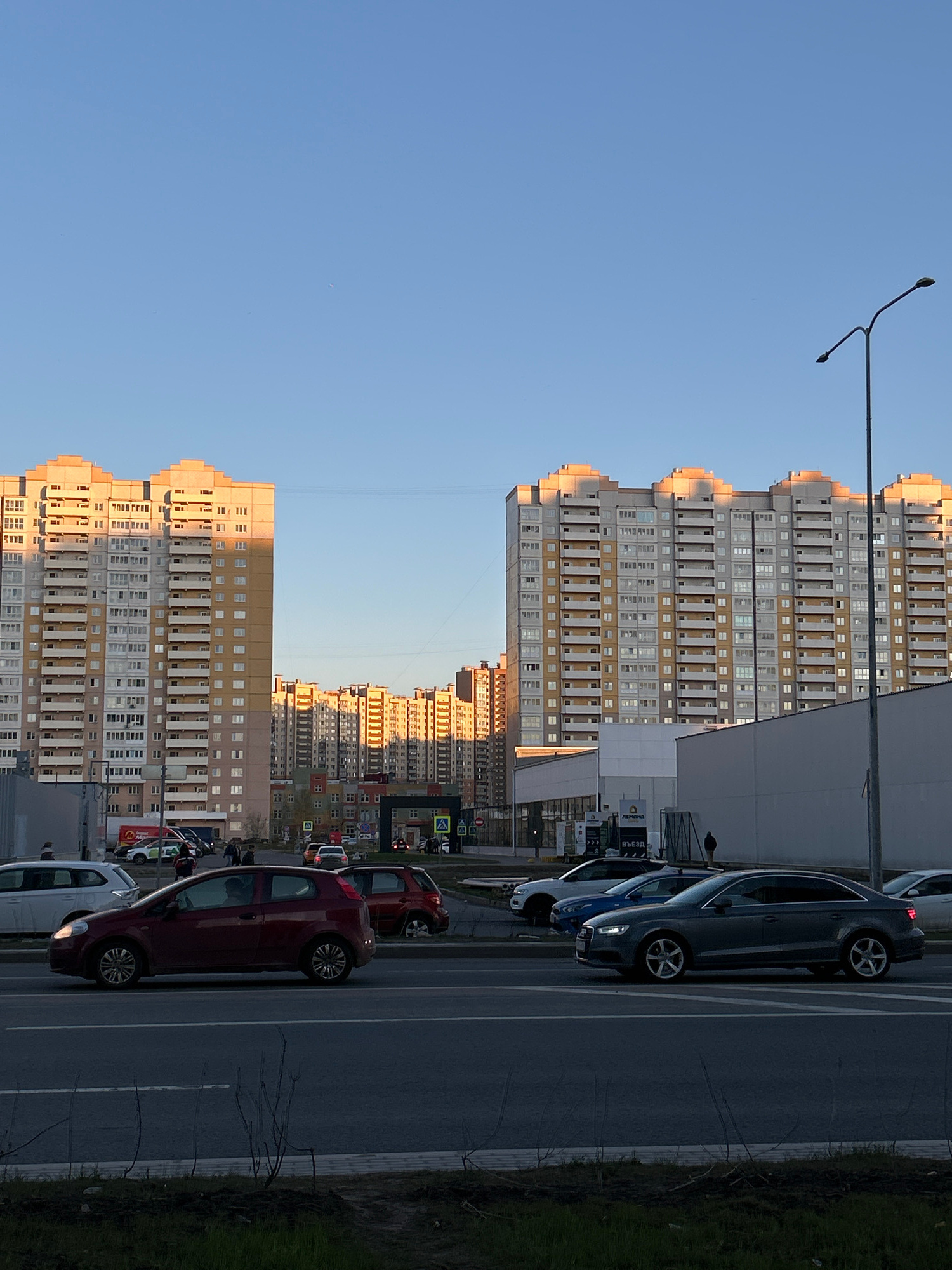 This image depicts an urban street scene in Saint Petersburg, Russia, likely captured during late afternoon or early evening. The sky is a clear, bright blue, indicating sunny weather. The low sun cas…read more