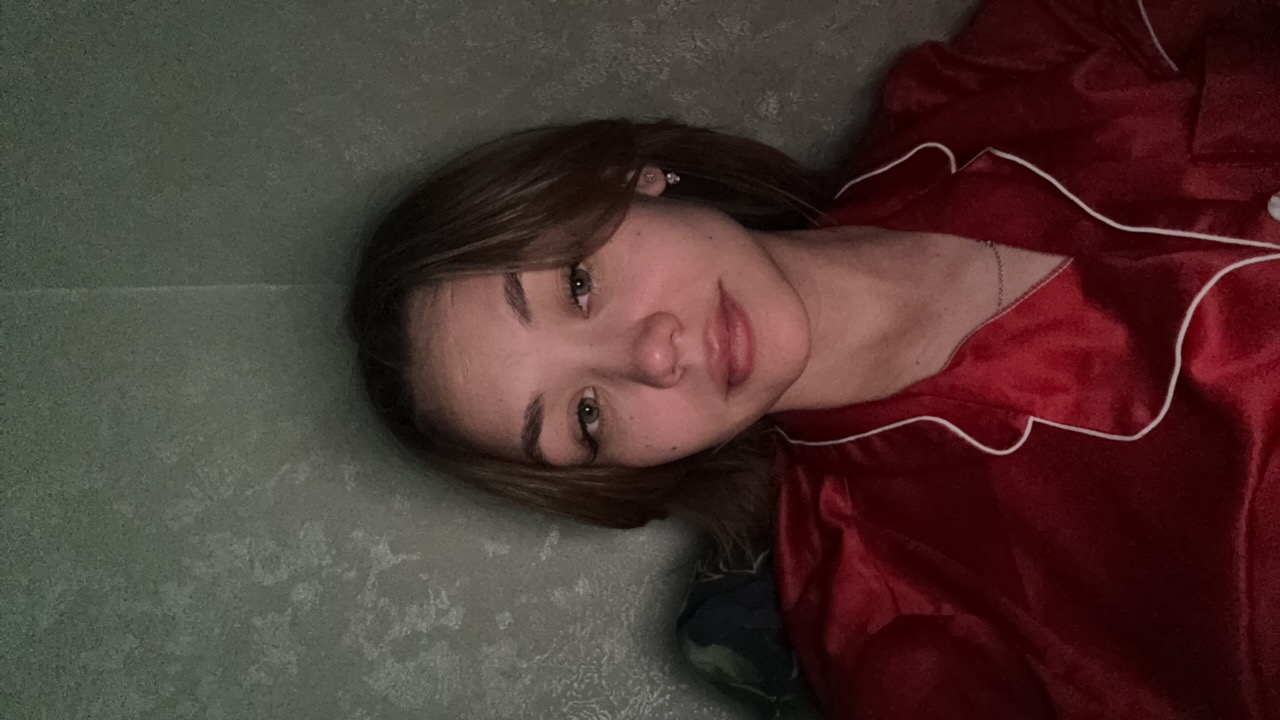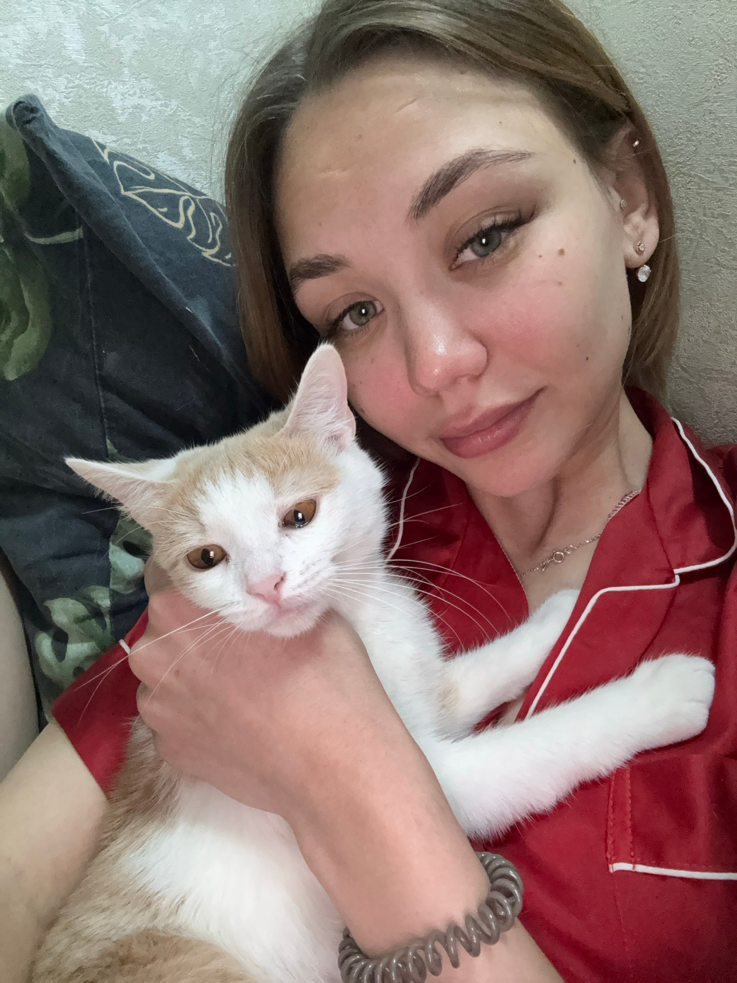 A person is lying down and holding a cat. The person has light skin, light brown hair, and green eyes. They are wearing a red pajama top with white trim and a silver necklace. The cat is mostly white…read more
