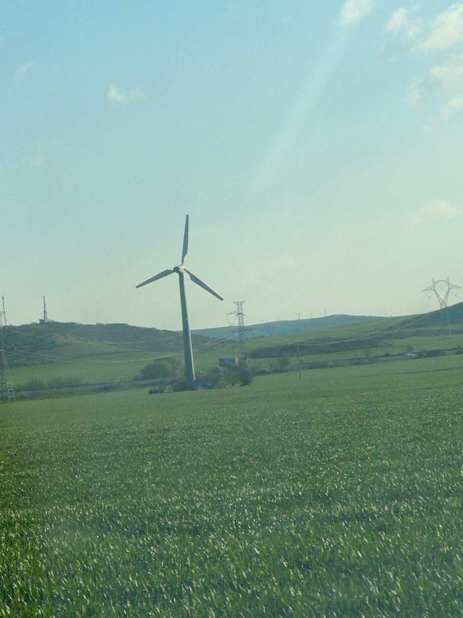 The image depicts a rural landscape in Bulgarovo, Bulgaria. Dominating the scene is a wind turbine with three blades, positioned against a backdrop of a clear, light blue sky with a few scattered clou…read more