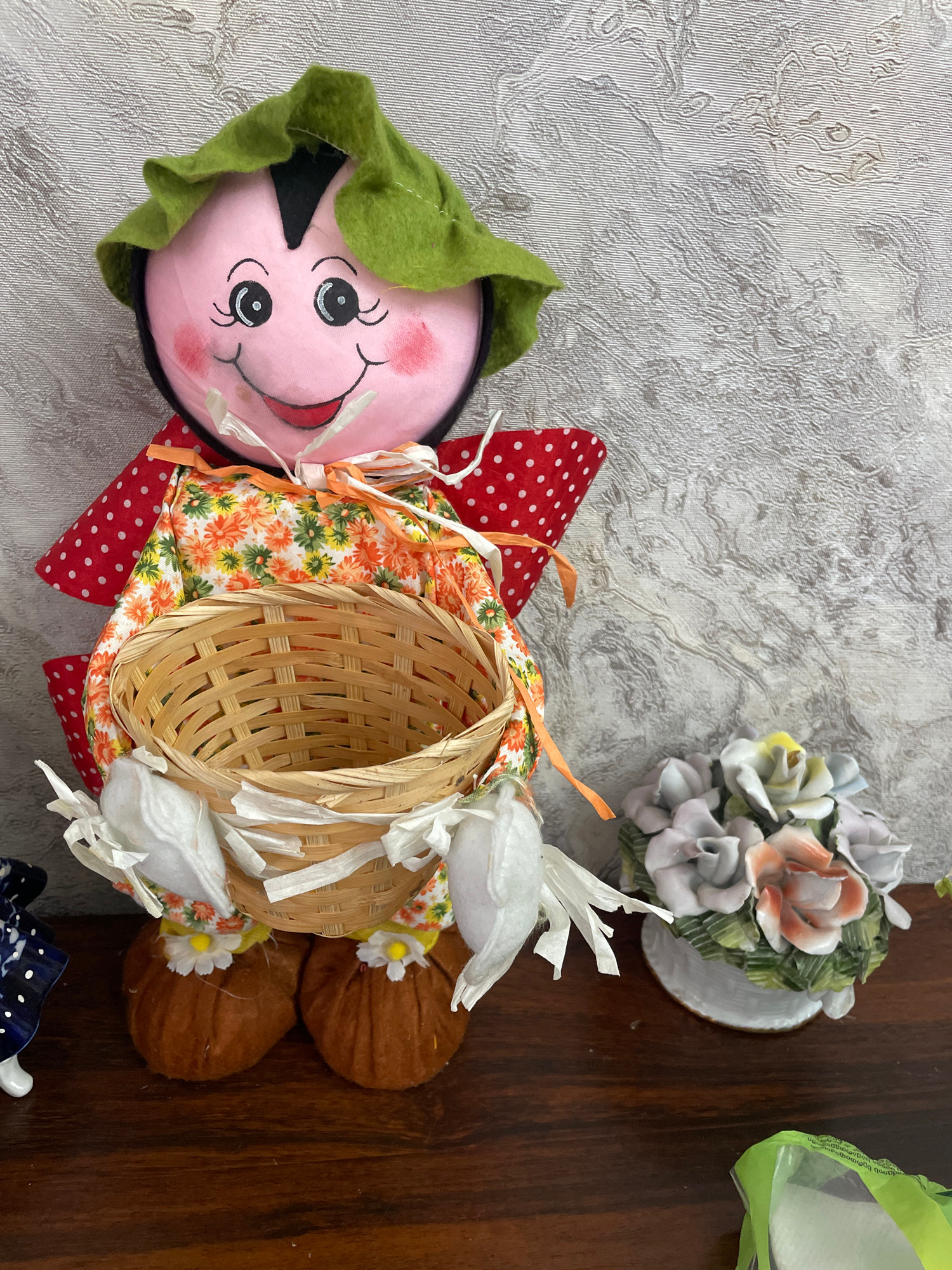 A still life features a textile doll resembling a fruit or vegetable with a pink face and green foliage-like hat, adorned with a small woven basket and white paper decorations. The doll is situated on…read more