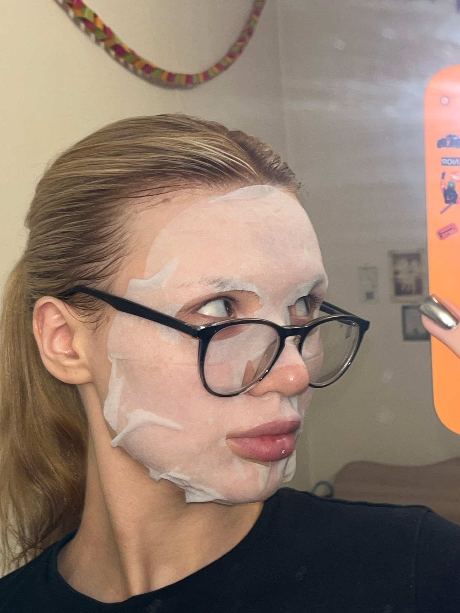 A woman with blond hair is wearing a white sheet face mask and black-framed glasses. She is holding an orange phone in her right hand, with a silver fingernail visible. The background includes a wall…read more