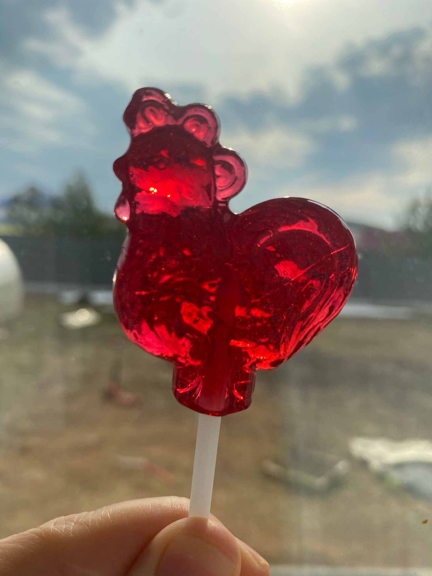 A red, heart-shaped lollipop on a white stick is being held in front of a window. The background visible through the window suggests an outdoor scene with sky and trees. The location is not explicitly…read more
