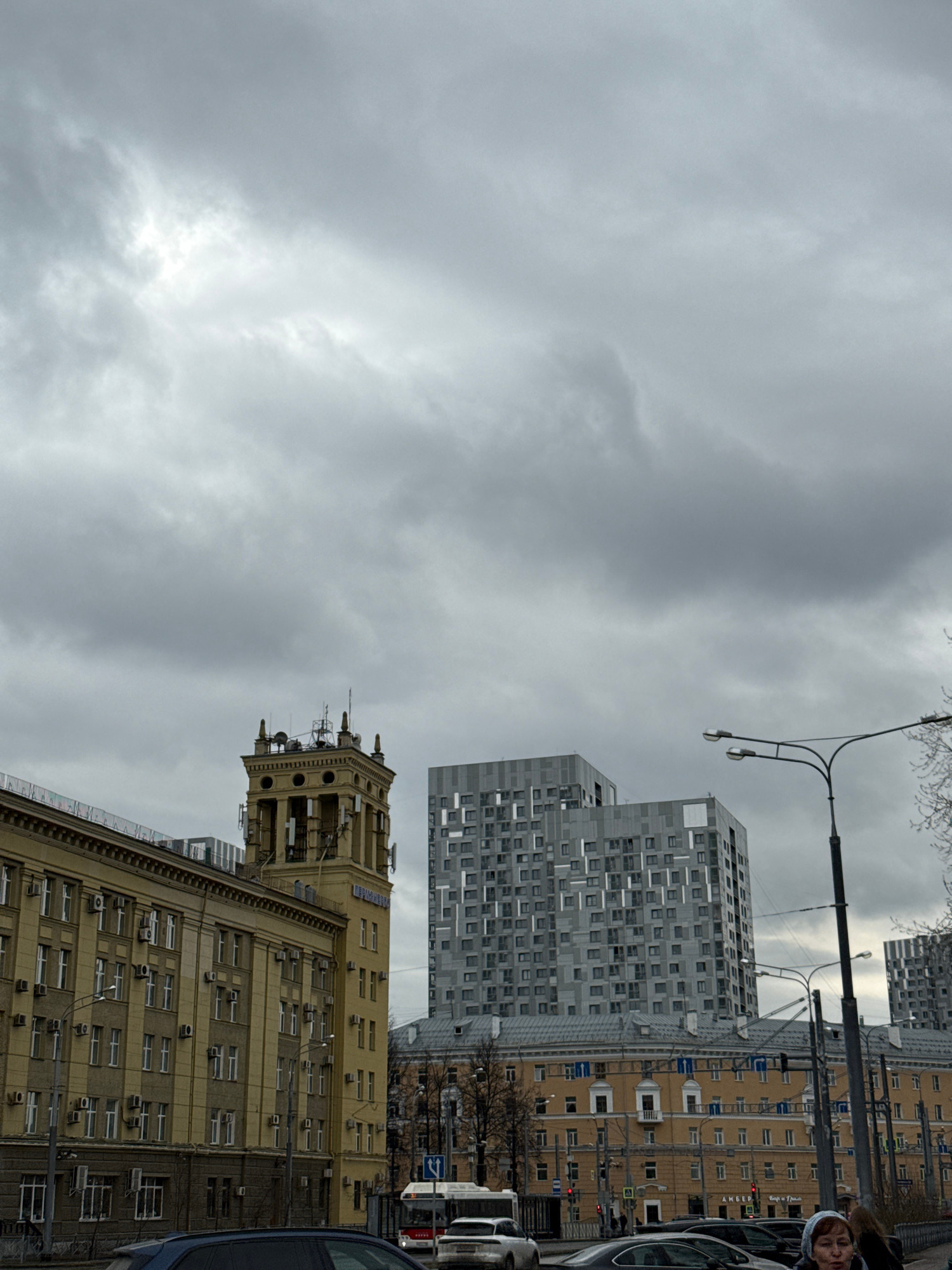 The image shows a street scene in Perm, Russia, under a cloudy sky. A beige building with multiple air conditioning units on its façade stands on the right. Adjacent to it is a modern gray building wi…read more
