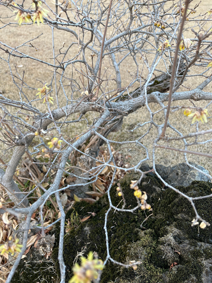 An upward shot captures a tree's bare branches, with delicate yellow flowers budding amidst the twigs. The tree's bark is textured with ridges, creating an interesting pattern. The background contrast…read more