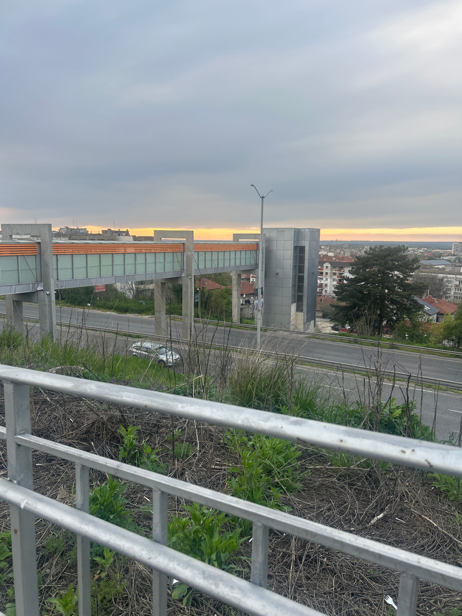 This media file presents an elevated view of an urban landscape in Ruse, Bulgaria, captured during either sunrise or sunset, indicated by a prominent golden-orange band of light along the horizon. The…read more