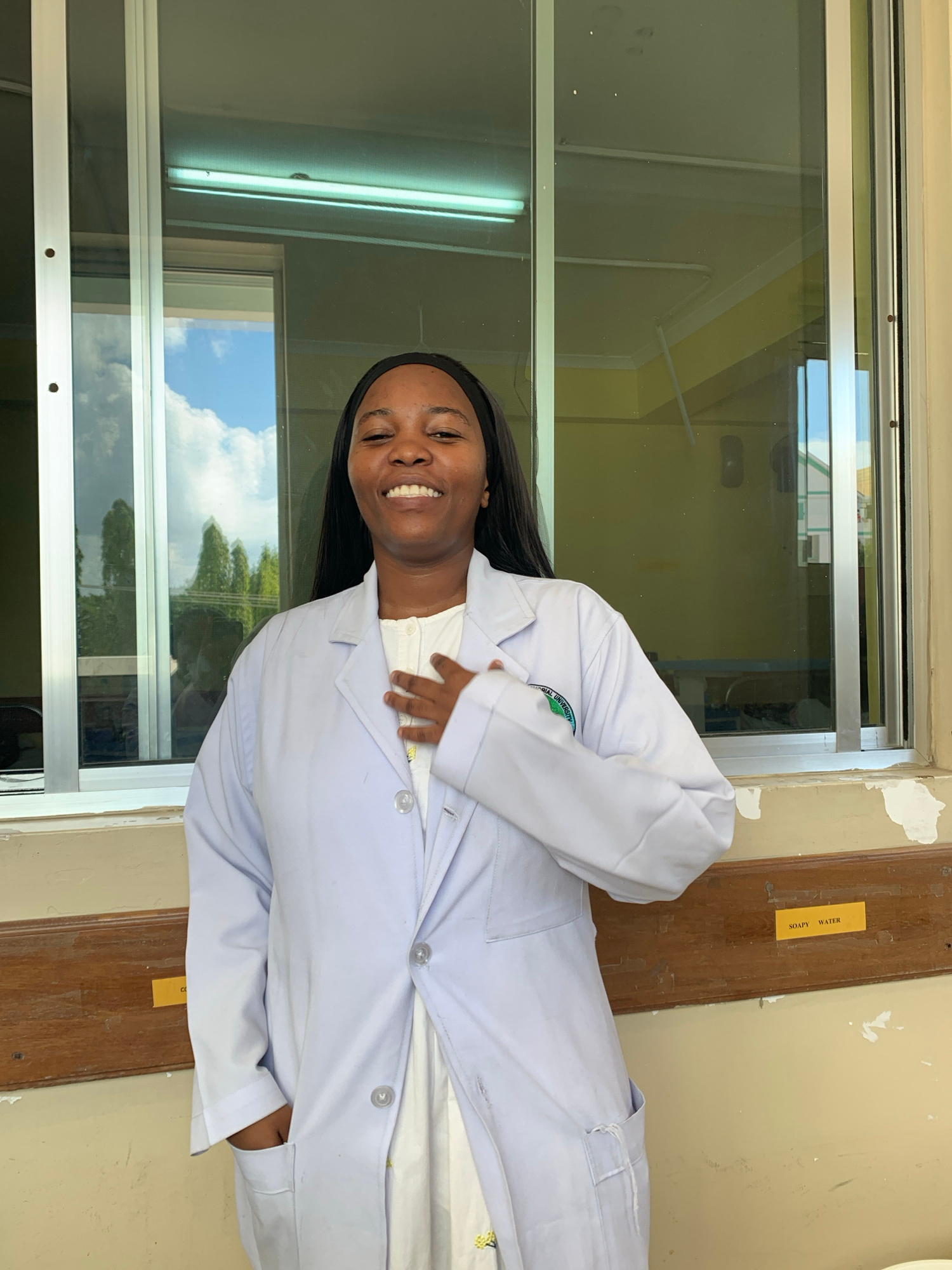 A young woman wearing a white lab coat is smiling and standing indoors, likely in a laboratory or medical facility, based on her attire. Reflected in the window behind her are trees and a blue sky wit…read more