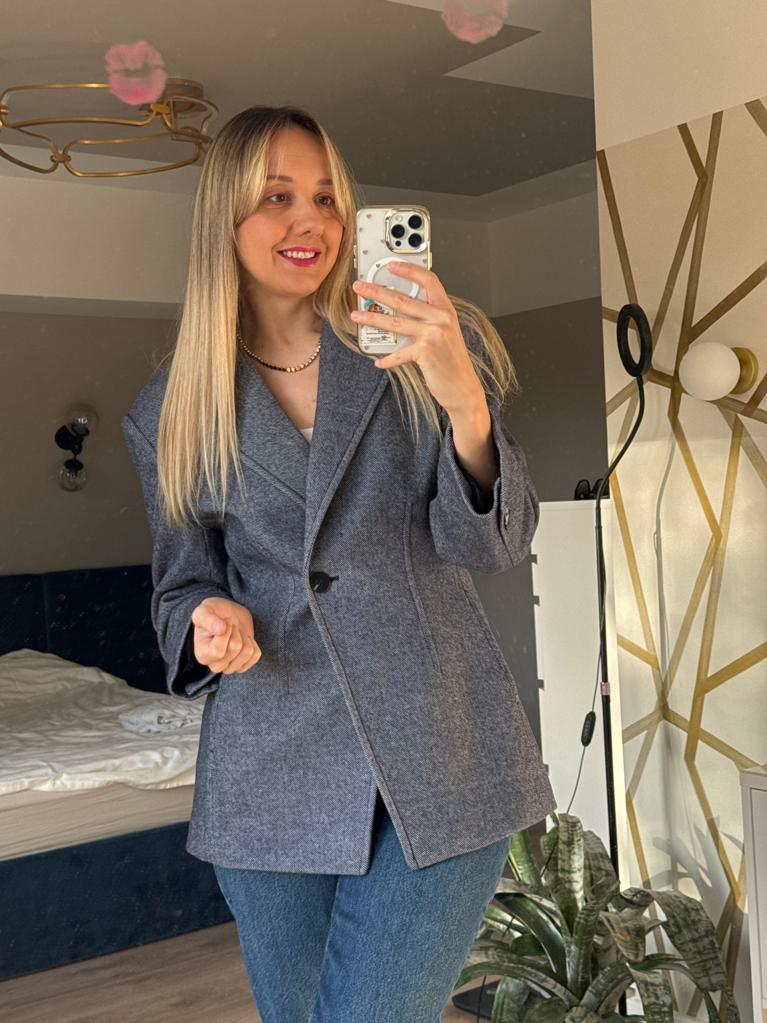 A woman stands in front of a mirror, holding a smartphone to take a selfie. She is wearing a gray coat and blue jeans. Her blonde hair is long and straight. The background includes a wall with a geome…read more