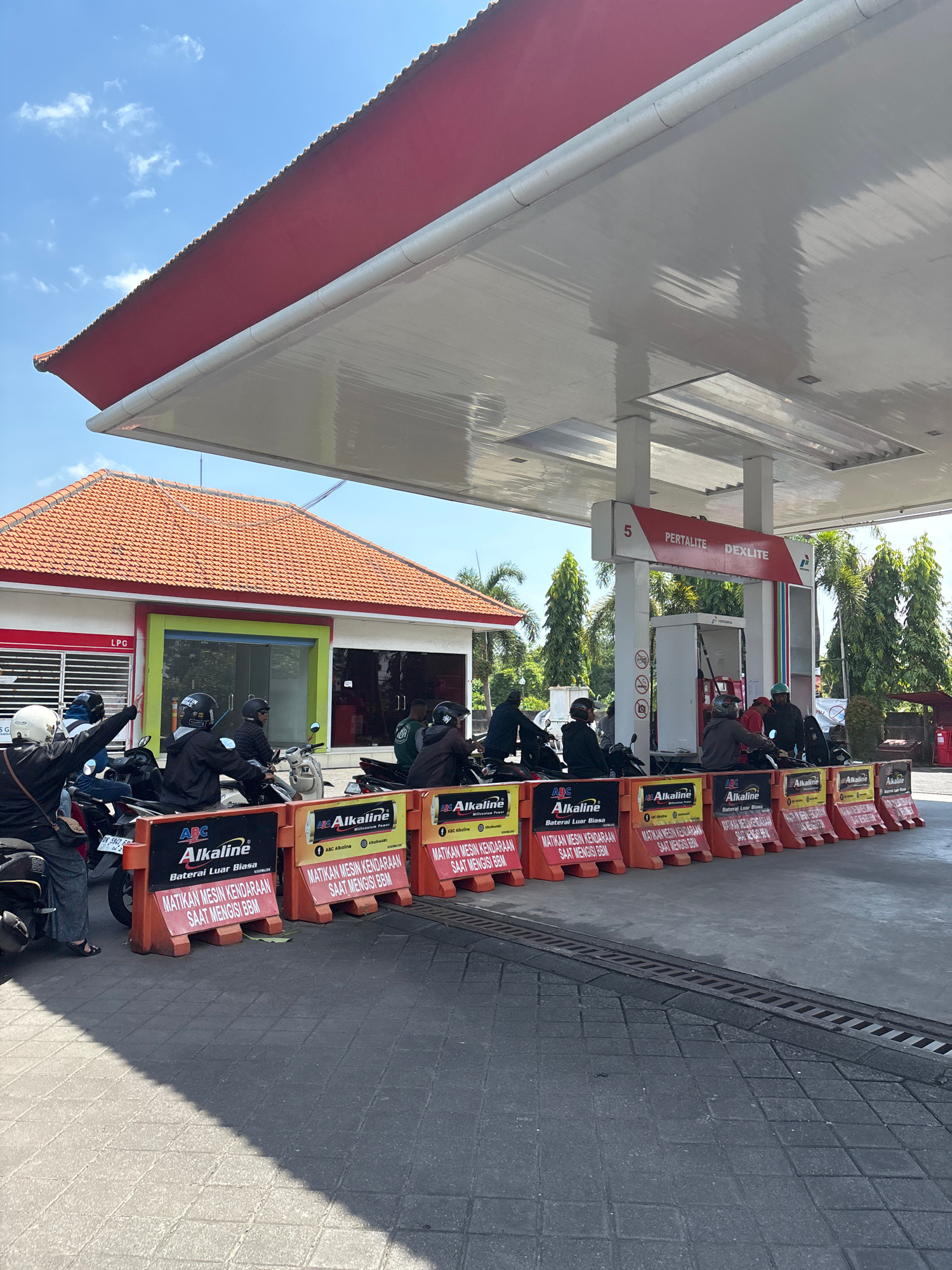 Here's a description of the image: The image depicts a scene at a Pertamina gas station, likely in Mengwi, Indonesia, given the license plate on the motorbikes. A line of motorbikes is queued up at t…read more